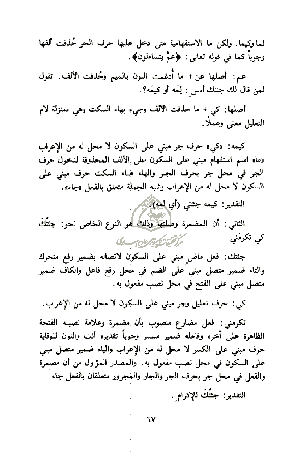 كيمه: «كي» حرف جر مبني على السكون لا محل له من الإعراب «ما» اسم استفهام مبني على السكون على الألف المحذوفة لدخول حرف الجر في محل جر بحرف الجر والهاء هاء السكت حرف مبني على السكون لا محل له من الإعراب وشبه الجملة متعلق بالفعل «جاء».