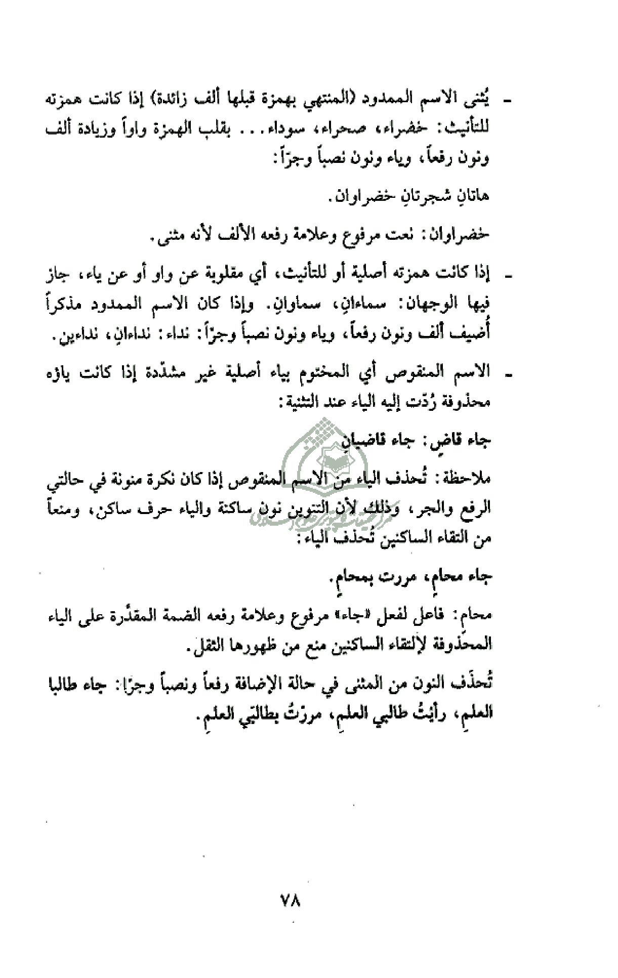 - يثنى الاسم الممدود (المنتهي بهمزة قبلها ألف زائدة) إذا كانت همزته للتأنيث: خضراء، صحراء، سوداء ... بقلب الهمزة واوا وزيادة ألف ونون رفعا، وياء ونون نصبا وجرّا: