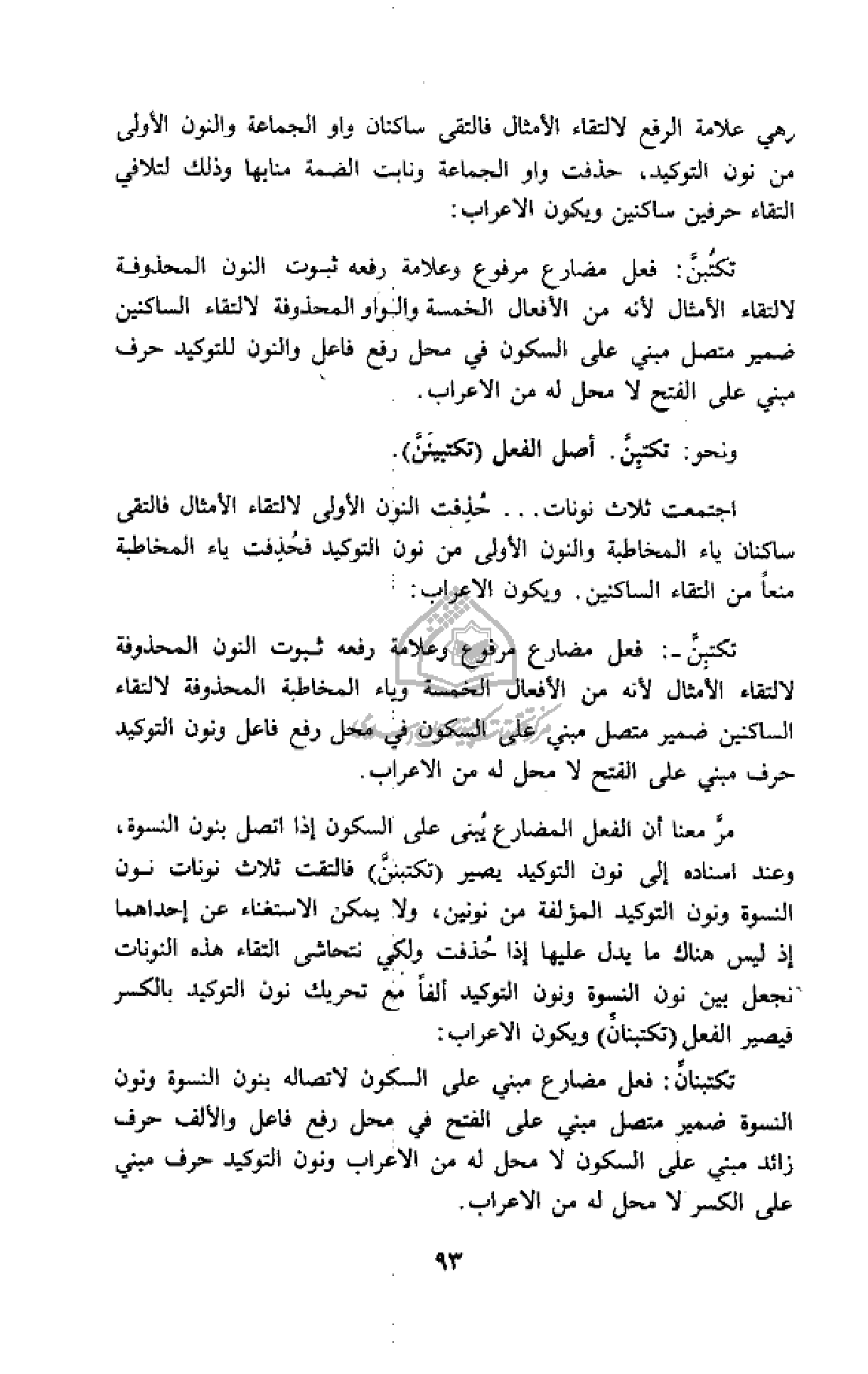 (تكتبننّ) فالتقت ثلاث نونات نون النسوة ونون التوكيد المؤلفة من نونين، ولا يمكن الاستغناء عن إحداهما إذ ليس هناك ما يدل عليها إذا حذفت ولكي نتحاشى التقاء هذه النونات نجعل بين نون النسوة ونون التوكيد ألفا مع تحريك نون التوكيد بالكسر فيصير الفعل (تكتبنانّ) ويكون الاعراب: