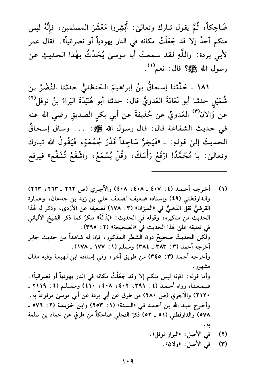 181 - حَدَّثَنَا إِسْحَاقُ بْنُ إِبْرَاهِيمَ الْحَنْظَلِيُّ، ثنا النَّضْرُ بْنُ شُمَيْلٍ، ثنا أَبُو نَعَامَةَ الْعَدَوِيُّ، قَالَ: ثنا أَبُو هُنَيْدَةَ الْبَرَاءُ بْنُ نَوْفَلٍ، عَنْ وَالِانَ الْعَدَوِيِّ، عَنْ حُذَيْفَةَ، عَنْ أَبِي بَكْرٍ الصِّدِّيقِ، رَضِيَ اللَّهُ عَنْهُ فِي حَدِيثِ الشَّفَاعَةِ قَالَ: قَالَ رَسُولُ اللَّهِ صَلَّى اللهُ عَلَيْهِ وَسَلَّمَ. وَسَاقَ إِسْحَاقُ الْحَدِيثَ إِلَى قَوْلِهِ: " §يَخِرُّ سَاجِدًا قَدْرَ جُمُعَةٍ، فَيَقُولُ اللَّهُ تَبَارَكَ وَتَعَالَى: يَا مُحَمَّدُ ارْفَعْ رَأْسَكَ، وَقُلْ يُسْمَعْ، وَاشْفَعْ تُشَفَّعْ "، فَيَرْفَعُ -[110]- رَأْسَهُ، فَإِذَا نَظَرَ إِلَى رَبِّهِ خَرَّ سَاجِدًا قَدْرَ جُمُعَةٍ أُخْرَى