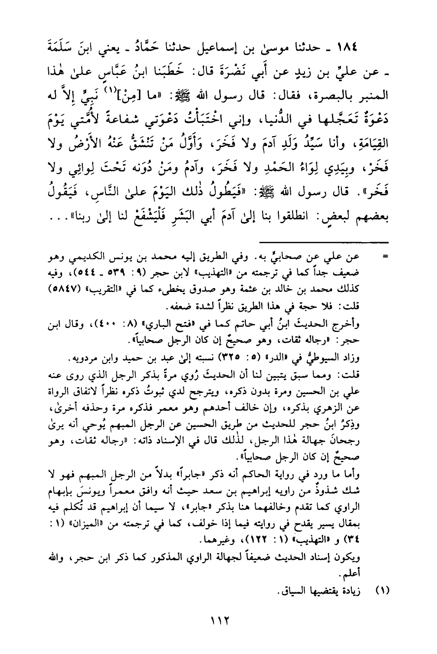 184 - حَدَّثَنَا مُوسَى بْنُ إِسْمَاعِيلَ، ثنا حَمَّادٌ يَعْنِي ابْنَ سَلَمَةَ، عَنْ عَلِيِّ بْنِ زَيْدٍ، عَنْ أَبِي نَضْرَةَ، قَالَ: خَطَبَنَا ابْنُ عَبَّاسٍ عَلَى هَذَا الْمِنْبَرِ بِالْبَصْرَةِ، فَقَالَ: قَالَ رَسُولُ اللَّهِ صَلَّى اللهُ عَلَيْهِ وَسَلَّمَ: «§مَا مِنْ نَبِيٍّ إِلَّا لَهُ دَعْوَةٌ تَعَجَّلَهَا فِي الدُّنْيَا، وَإِنِّي اخْتَبَأْتُ دَعْوَتِي شَفَاعَةً لِأُمَّتِي يَوْمَ الْقِيَامَةِ، وَأَنَا سَيِّدُ وَلَدِ آدَمَ وَلَا فَخْرَ، وَأَوَّلُ مَنْ تَنْشَقُّ عَنْهُ الْأَرْضُ وَلَا فَخْرَ، وَبِيَدِي لِوَاءُ الْحَمْدِ وَلَا فَخْرَ، وَآدَمُ وَمَنْ دُونَهُ تَحْتَ لِوَائِي وَلَا فَخْرَ» قَالَ رَسُولُ اللَّهِ صَلَّى اللهُ عَلَيْهِ وَسَلَّمَ: " فَيَطُولُ ذَلِكَ الْيَوْمُ عَلَى النَّاسِ، فَيَقُولُ بَعْضُهُمْ لِبَعْضٍ: انْطَلِقُوا بِنَا إِلَى آدَمَ أَبِي الْبَشَرِ، فَلْيَشْفَعْ لَنَا إِلَى رَبِّنَا " -[113]- وَسَاقَ الْحَدِيثَ إِلَى قَوْلِهِ: " فَآتِي بَابَ الْجَنَّةِ فَآخُذُ بِحَلْقَةِ الْبَابِ، فَأَقْرَعُ الْبَابَ، فَيُقَالُ: مَنْ أَنْتَ؟، فَأَقُولُ: أَنَا مُحَمَّدٌ، فَيُفْتَحُ الْبَابُ، فَآتِي رَبِّي وَهُوَ عَلَى كُرْسِيِّهِ، أَوْ عَلَى سَرِيرِهِ، فَيَتَجَلَّى لِي رَبِّي، فَأَخِرُّ لَهُ سَاجِدًا "، وَسَاقَ أَبُو سَلَمَةَ الْحَدِيثَ بِطُولِهِ إِلَى آخِرِهِ