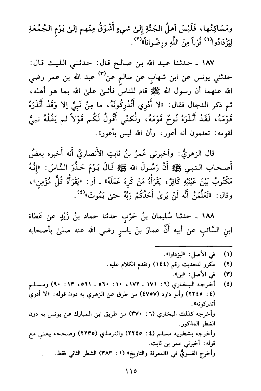 188 - حَدَّثَنَا سُلَيْمَانُ بْنُ حَرْبٍ، ثنا حَمَّادُ بْنُ زَيْدٍ، عَنْ عَطَاءِ بْنِ السَّائِبِ، عَنْ أَبِيهِ، أَنَّ عَمَّارَ بْنَ يَاسِرٍ، رَضِيَ اللَّهُ عَنْهُ صَلَّى بِأَصْحَابِهِ -[116]- صَلَاةً أَوْجَزَ فِيهَا، فَقِيلَ لَهُ: خَفَّفْتَ فَقَالَ: أَمَا إِنِّي قَدْ دَعَوْتُ فِيهَا بِدُعَاءٍ سَمِعْتُهُ مِنْ رَسُولِ اللَّهِ صَلَّى اللهُ عَلَيْهِ وَسَلَّمَ، وَمَضَى، فَتَبِعَهُ رَجُلٌ فَسَأَلَهُ عَنِ الدُّعَاءِ، ثُمَّ رَجَعَ إِلَى الْقَوْمِ فَأَخْبَرَهُمْ، فَقَالَ: «§اللَّهُمَّ إِنِّي أَسْأَلُكَ بِعِلْمِكَ الْغَيْبَ، وَقُدْرَتِكَ عَلَى الْخَلْقِ، أَحْيِنِي مَا عَلِمْتَ الْحَيَاةَ خَيْرًا لِي، وَتَوَفَّنِي إِذَا كَانَتِ الْوَفَاةُ خَيْرًا لِي، وَأَسْأَلُكَ خَشْيَتَكَ فِي الْغَيْبِ وَالشَّهَادَةِ، وَأَسْأَلُكَ كَلِمَةَ الْحَقِّ فِي الْغَضَبِ وَالرِّضَا، وَأَسْأَلُكَ الْقَصْدَ فِي الْفَقْرِ وَالْغِنَى، وَأَسْأَلُكَ نَعِيمًا لَا يَنْفَدُ، وَأَسْأَلُكَ قُرَّةَ عَيْنٍ لَا تَنْقَطِعُ، وَأَسْأَلُكَ الرِّضَا بَعْدَ الْقَضَاءِ، وَأَسْأَلُكَ بَرْدَ الْعَيْشِ بَعْدَ الْمَوْتِ، وَأَسْأَلُكَ لَذَّةَ النَّظَرِ إِلَى وَجْهِكَ، وَأَسْأَلُكَ الشَّوْقَ إِلَى لِقَائِكَ، فِي غَيْرِ ضَرَّاءَ مُضِرَّةٍ، وَلَا فِتْنَةٍ مُضِلَّةٍ، اللَّهُمَّ زَيِّنَّا بِزِينَةِ الْإِيمَانِ، وَاجْعَلْنَا هُدَاةً مُهْتَدِينَ»