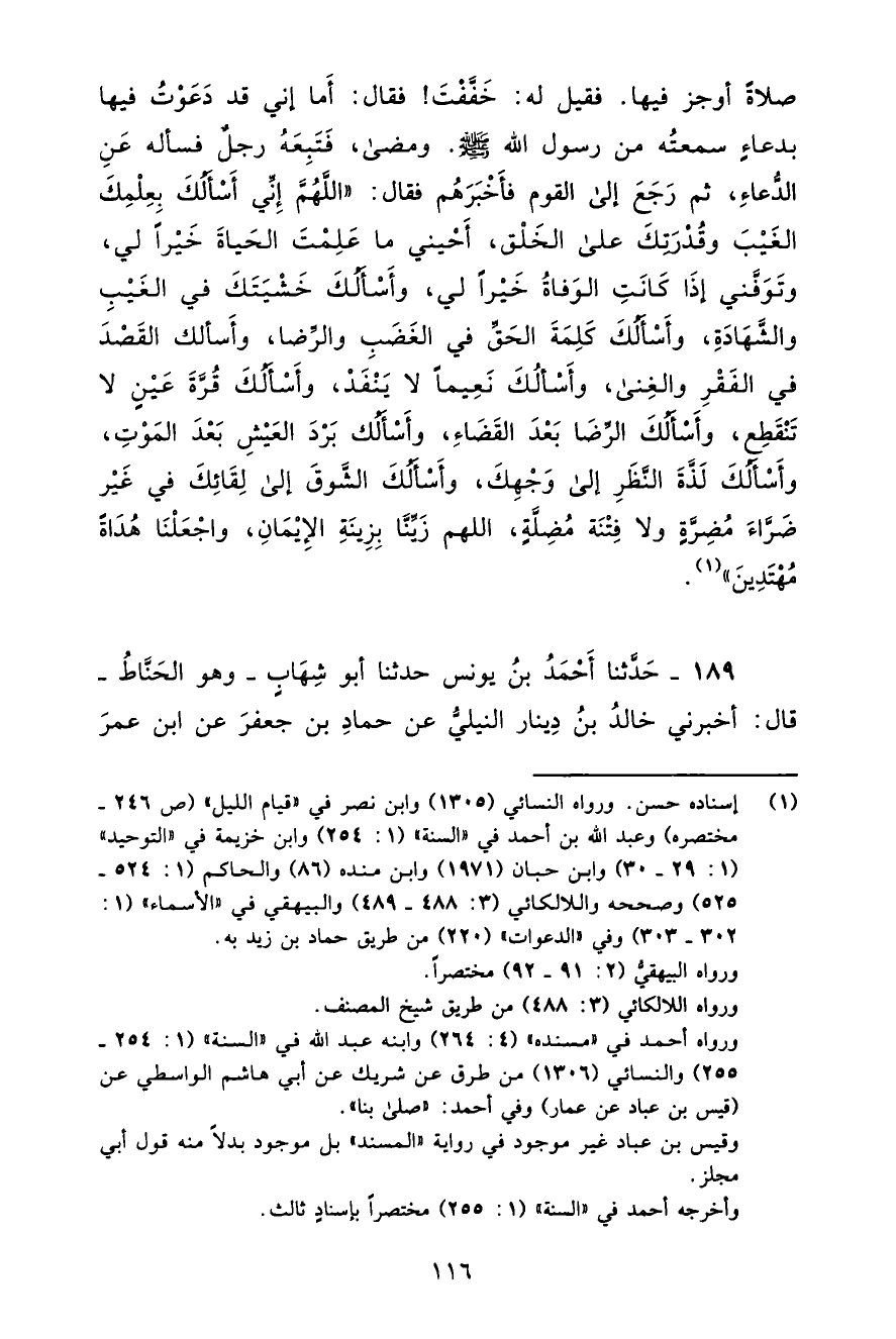 189 - حَدَّثَنَا أَحْمَدُ بْنُ يُونُسَ، ثنا أَبُو شِهَابٍ وَهُوَ الْحَنَّاطُ قَالَ: أَخْبَرَنِي خَالِدُ بْنُ دِينَارٍ النِّيلِيُّ، عَنْ حَمَّادِ بْنِ جَعْفَرٍ، عَنِ ابْنِ عُمَرَ -[117]-، رَضِيَ اللَّهُ عَنْهُمَا قَالَ: أَلَا أُخْبِرُكَ بِأَسْفَلِ، أَهْلِ الْجَنَّةِ؟ " وَسَاقَ أَحْمَدُ الْحَدِيثَ بِطُولِهِ قَالَ: «حَتَّى إِذَا بَلَغَ النَّعِيمُ مِنْهُمْ كُلَّ مَبْلَغٍ، وَظَنُّوا أَنْ لَا نَعِيمَ أَفْضَلُ مِنْهُ، §تَجَلَّى لَهُمُ الرَّبُّ، فَنَظَرُوا إِلَى وَجْهِ الرَّحْمَنِ» قَالَ أَحْمَدُ: قُلْتُ لِأَبِي شِهَابٍ: حَدِيثُ خَالِدِ بْنِ دِينَارٍ هَذَا فِي ذِكْرِ الْجَنَّةِ رَفَعَهُ؟ قَالَ: نَعَمْ