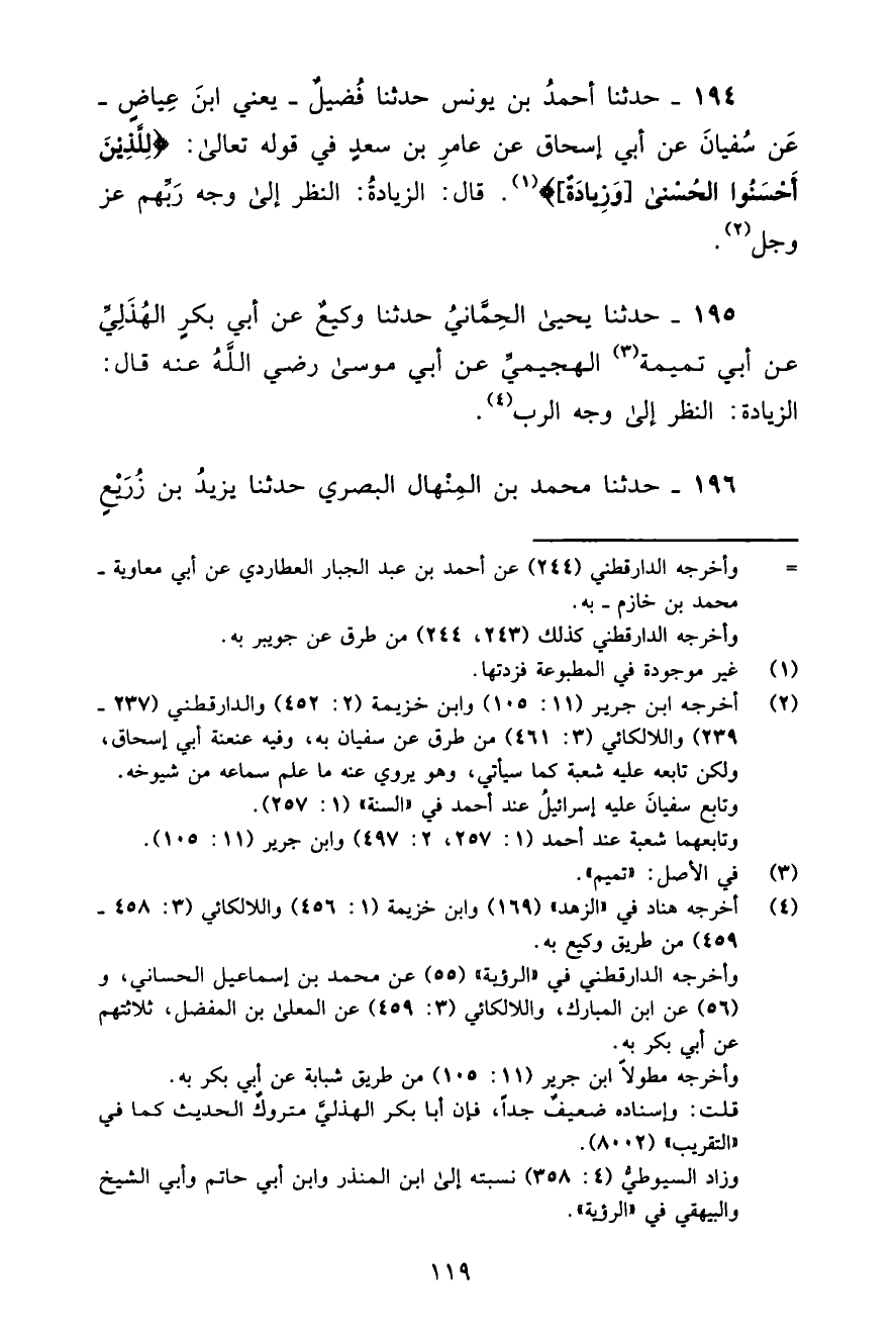 194 - حَدَّثَنَا أَحْمَدُ بْنُ يُونُسَ، ثنا فُضَيْلٌ يَعْنِي ابْنَ عِيَاضٍ، عَنْ سُفْيَانَ، عَنْ أَبِي إِسْحَاقَ، عَنْ عَامِرِ بْنِ سَعْدٍ، فِي قَوْلِهِ تَعَالَى: {§لِلَّذِينَ أَحْسَنُوا الْحُسْنَى وَزِيَادَةٌ} [يونس: 26] قَالَ: " الزِّيَادَةُ: النَّظَرُ إِلَى وَجْهِ رَبِّهِمْ عَزَّ وَجَلَّ "