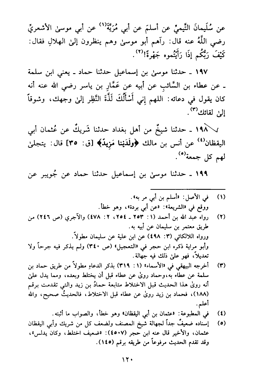 197 - حَدَّثَنَا مُوسَى بْنُ إِسْمَاعِيلَ، ثنا حَمَّادٌ يَعْنِي ابْنَ سَلَمَةَ، عَنْ عَطَاءِ بْنِ السَّائِبِ، عَنْ أَبِيهِ، عَنْ عَمَّارِ بْنِ يَاسِرٍ، رَضِيَ اللَّهُ عَنْهُ أَنَّهُ كَانَ يَقُولُ فِي دُعَائِهِ: «§اللَّهُمَّ إِنِّي أَسْأَلُكَ لَذَّةَ النَّظَرِ إِلَى وَجْهِكَ، وَشَوْقًا إِلَى لِقَائِكَ»