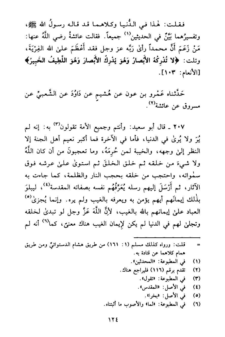 فَقَالَتْ عَائِشَةُ رَضِيَ اللَّهُ عَنْهَا: " §مَنْ زَعَمَ أَنَّ مُحَمَّدًا رَأَى رَبَّهُ عَزَّ وَجَلَّ فَقَدْ أَعْظَمَ عَلَى اللَّهِ الْفِرْيَةَ، وَتَلَتْ: {لَا تُدْرِكُهُ الْأَبْصَارُ وَهُوَ يُدْرِكُ الْأَبْصَارَ وَهُوَ اللَّطِيفُ الْخَبِيرُ} [الأنعام: 103] حَدَّثَنَاهُ عَمْرُو بِنُ عَوْنٍ، عَنْ هُشَيْمٍ، عَنْ دَاوُدَ، عَنِ الشَّعْبِيِّ، عَنْ مَسْرُوقٍ، عَنْ عَائِشَةَ