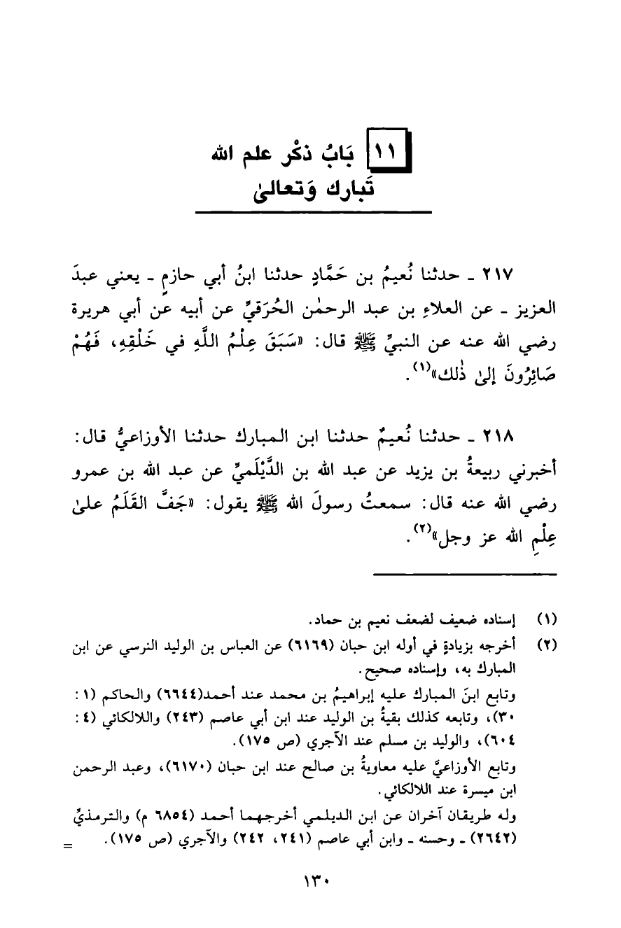 218 - حَدَّثَنَا نُعَيْمٌ، ثنا ابْنُ الْمُبَارَكِ، ثنا الْأَوْزَاعِيُّ، قَالَ: أَخْبَرَنِي رَبِيعَةُ بْنُ يَزِيدَ، عَنْ عَبْدِ اللَّهِ بْنِ الدَّيْلَمِيِّ، عَنْ عَبْدِ اللَّهِ بْنِ عَمْرٍو، رَضِيَ اللَّهُ عَنْهُ قَالَ: سَمِعْتُ رَسُولَ اللَّهِ صَلَّى اللهُ عَلَيْهِ وَسَلَّمَ يَقُولُ: «§جَفَّ الْقَلَمُ عَلَى عِلْمِ اللَّهِ عَزَّ وَجَلَّ»