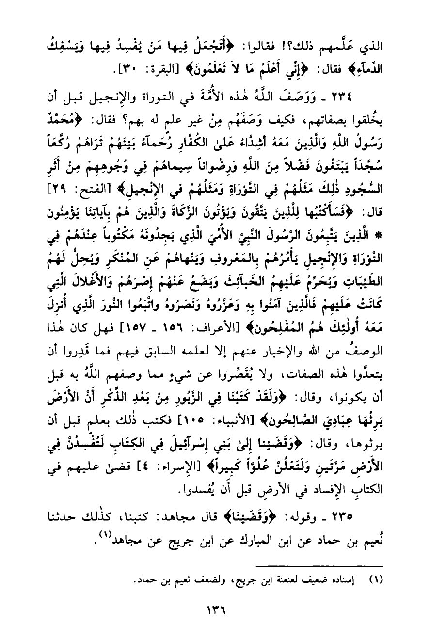 235 - وَقَوْلُهُ: {§وَقَضَيْنَا} [الإسراء: 4] قَالَ مُجَاهِدٌ: «كَتَبْنَا» ، كَذَلِكَ حَدَّثَنَا نُعَيْمُ بْنُ حَمَّادٍ، عَنِ ابْنِ الْمُبَارَكِ، عَنِ ابْنِ جُرَيْجٍ، عَنْ مُجَاهِدٍ
