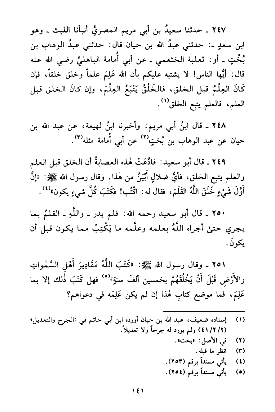 247 - حَدَّثَنَا سَعِيدُ بْنُ أَبِي مَرْيَمَ الْمِصْرِيُّ، أَنْبَأَ اللَّيْثُ وَهُوَ ابْنُ سَعْدٍ: حَدَّثَنِي عَبْدُ اللَّهِ بْنُ حَيَّانَ، قَالَ: حَدَّثَنِي عَبْدُ الْوَهَّابِ بْنُ بُخْتٍ، أَوْ ثَعْلَبَةُ الْخَثْعَمِيُّ، عَنْ أَبِي أُمَامَةَ الْبَاهِلِيِّ، رَضِيَ اللَّهُ عَنْهُ قَالَ: «أَيُّهَا النَّاسُ، §لَا يَشْتَبِهُ عَلَيْكُمْ بِأَنَّ اللَّهَ عَلِمَ عِلْمًا، وَخَلَقَ خَلْقًا، فَإِنْ كَانَ الْعِلْمُ قَبْلَ الْخَلْقِ فَالْخَلْقُ يَتْبَعُ الْعِلْمَ، وَإِنْ كَانَ الْخَلْقُ قَبْلَ الْعِلْمِ فَالْعِلْمُ يَتْبَعُ الْخَلْقَ»