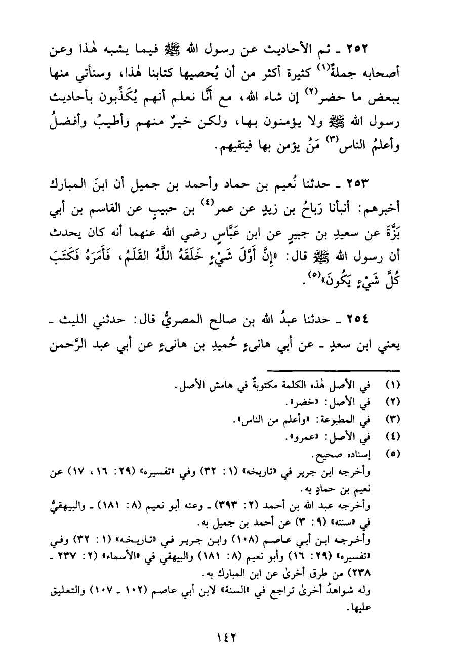 حَدَّثَنَا نُعَيْمُ بْنُ حَمَّادٍ، وَأَحْمَدُ بْنُ جَمِيلٍ، أَنَّ ابْنَ الْمُبَارَكِ، أَخْبَرَهُمْ: أَنْبَأَ رَبَاحُ بْنُ زَيْدٍ، عَنْ عُمَرَ بْنِ حَبِيبٍ، عَنِ الْقَاسِمِ بْنِ أَبِي بَزَّةَ، عَنْ سَعِيدِ بْنِ جُبَيْرٍ، عَنِ ابْنِ عَبَّاسٍ، رَضِيَ اللَّهُ عَنْهُمَا أَنَّهُ كَانَ يُحَدِّثُ أَنَّ رَسُولَ اللَّهِ صَلَّى اللهُ عَلَيْهِ وَسَلَّمَ قَالَ: «إِنَّ §أَوَّلَ شَيْءٍ خَلَقَهُ اللَّهُ الْقَلَمُ، فَأَمَرَهُ فَكَتَبَ كُلَّ شَيْءٍ يَكُونُ»