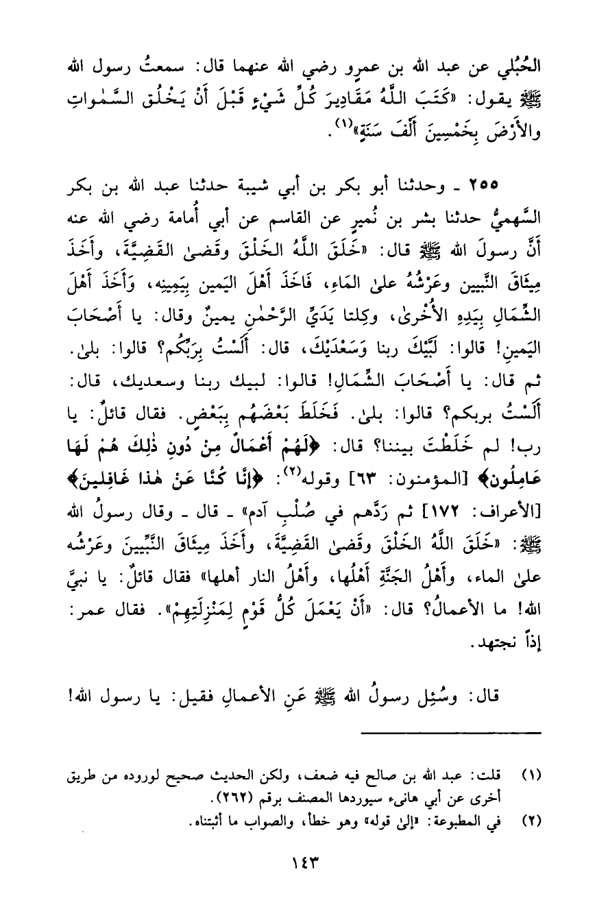 255 - وَحَدَّثَنَا أَبُو بَكْرِ بْنُ أَبِي شَيْبَةَ، ثنا عَبْدُ اللَّهِ بْنُ بَكْرٍ السَّهْمِيُّ، ثنا بِشْرُ بْنُ نُمَيْرٍ، عَنِ الْقَاسِمِ، عَنْ أَبِي أُمَامَةَ، رَضِيَ اللَّهُ عَنْهُ أَنَّ رَسُولَ اللَّهِ صَلَّى اللهُ عَلَيْهِ وَسَلَّمَ قَالَ: " §خَلَقَ اللَّهُ الْخَلْقَ، وَقَضَى الْقَضِيَّةَ، وَأَخَذَ مِيثَاقَ النَّبِيِّينَ، وَعَرْشُهُ عَلَى الْمَاءِ، فَأَخَذَ أَهْلَ الْيَمِينِ بِيَمِينِهِ، وَأَخَذَ أَهْلَ الشِّمَالِ بِيَدِهِ الْأُخْرَى، وَكِلْتَا يَدَيِ الرَّحْمَنِ يَمِينٌ، وَقَالَ: يَا أَصْحَابَ الْيَمِينِ قَالُوا: لَبَّيْكَ وَسَعْدَيْكَ قَالَ: أَلَسْتُ بِرَبِّكُمْ؟ قَالُوا: بَلَى. ثُمَّ قَالَ: يَا أَصْحَابَ الشِّمَالِ قَالُوا: لَبَّيْكَ رَبَّنَا وَسَعْدَيْكَ، قَالَ: أَلَسْتُ بِرَبِّكُمْ؟ قَالُوا: بَلَى، فَخَلَطَ بَعْضُهُمْ بِبَعْضٍ، فَقَالَ قَائِلٌ: يَا رَبِّ لِمَ خَلَطْتَ بَيْنَنَا؟ قَالَ: {لَهُمْ أَعْمَالٌ مِنْ دُونِ} [المؤمنون: 63] ذَلِكَ هُمْ لَهَا عَامِلُونَ. وَقَوْلُهُ: {إِنَّا كُنَّا عَنْ هَذَا غَافِلِينَ} [الأعراف: 172] ، ثُمَّ رَدَّهُمْ فِي صُلْبِ آدَمَ " قَالَ: وَقَالَ رَسُولُ اللَّهِ صَلَّى اللهُ عَلَيْهِ وَسَلَّمَ: «خَلَقَ اللَّهُ الْخَلْقَ، وَقَضَى الْقَضِيَّةَ، وَأَخَذَ مِيثَاقَ النَّبِيِّينَ، وَعَرْشُهُ عَلَى الْمَاءِ، وَأَهْلُ الْجَنَّةِ أَهْلُهَا، وَأَهْلُ النَّارِ أَهْلُهَا» ، فَقَالَ قَائِلٌ: يَا نَبِيَّ اللَّهِ مَا الْأَعْمَالُ؟ قَالَ: «أَنْ يَعْمَلَ كُلُّ قَوْمٍ لِمَنْزِلَتِهِمْ» ، فَقَالَ عُمَرُ: إِذًا نِجْتَهِدُ. قَالَ: وَسُئِلَ رَسُولُ اللَّهِ صَلَّى اللهُ عَلَيْهِ وَسَلَّمَ عَنِ الْأَعْمَالِ، فَقِيلَ: يَا رَسُولَ اللَّهِ -[144]- أَرَأَيْتَ الْأَعْمَالَ، أَهُوَ شَيْءٌ يُؤْتَنَفُ، أَوْ فُرِغَ مِنْهَا؟ قَالَ: «بَلْ فُرِغَ مِنْهَا»