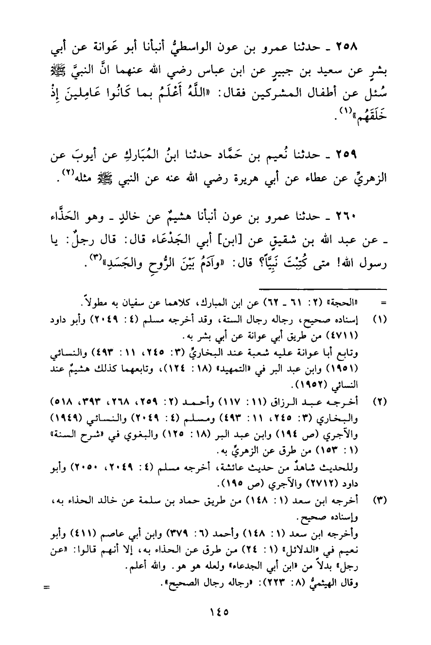 258 - حَدَّثَنَا عَمْرُو بْنُ عَوْنٍ الْوَاسِطِيُّ، أَنْبَأَ أَبُو عَوَانَةَ، عَنْ أَبِي بِشْرٍ، عَنْ سَعِيدِ بْنِ جُبَيْرٍ، عَنِ ابْنِ عَبَّاسٍ، رَضِيَ اللَّهُ عَنْهُمَا أَنَّ النَّبِيَّ صَلَّى اللهُ عَلَيْهِ وَسَلَّمَ سُئِلَ عَنْ أَطْفَالِ الْمُشْرِكِينَ، فَقَالَ: «§اللَّهُ أَعْلَمُ بِمَا كَانُوا عَامِلِينَ إِذْ خَلَقَهُمْ»