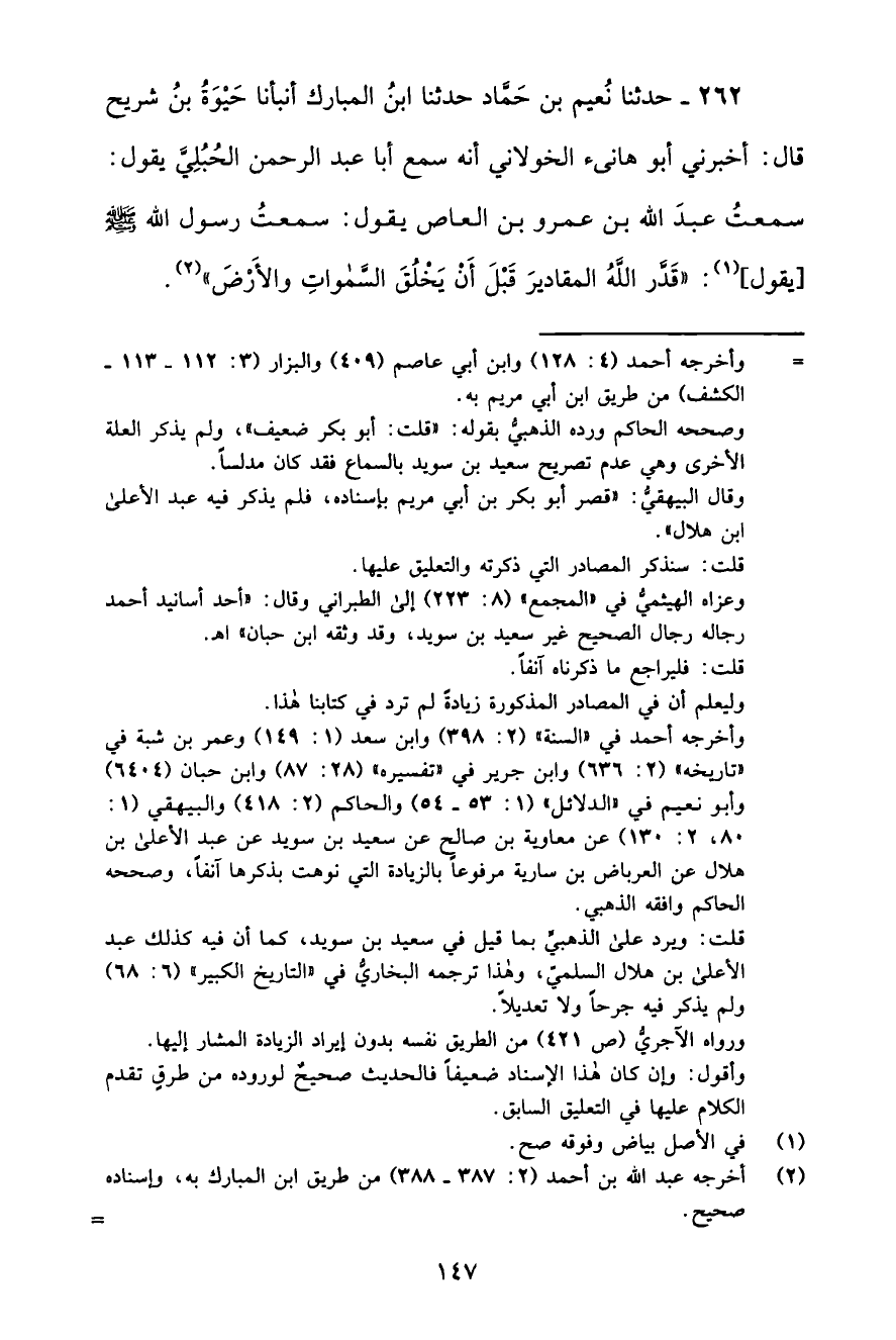 262 - حَدَّثَنَا نُعَيْمُ بْنُ حَمَّادٍ، ثنا ابْنُ الْمُبَارَكِ، أَنْبَأَ حَيْوَةُ بْنُ شُرَيْحٍ، قَالَ: أَخْبَرَنِي أَبُو هَانِئٍ الْخَوْلَانِيُّ، أَنَّهُ سَمِعَ أَبَا عَبْدِ الرَّحْمَنِ الْحُبُلِيَّ، يَقُولُ: سَمِعْتُ عَبْدَ اللَّهِ بْنَ عَمْرِو بْنِ الْعَاصِ، يَقُولُ: سَمِعْتُ رَسُولَ اللَّهِ صَلَّى اللهُ عَلَيْهِ وَسَلَّمَ يَقُولُ: «§قَدَّرَ اللَّهُ الْمَقَادِيرَ قَبْلَ أَنْ يَخْلُقَ السَّمَوَاتِ وَالْأَرْضَ»