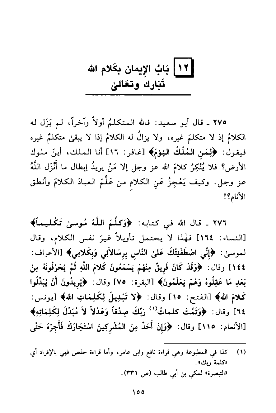 275 - قَالَ أَبُو سَعِيدٍ: فَاللَّهُ الْمُتَكَلِّمُ أَوَّلًا وَآخِرًا، لَمْ يَزَلْ لَهُ الْكَلَامُ، إِذْ لَا مُتَكَلِّمَ غَيْرُهُ، وَلَا يَزَالُ لَهُ الْكَلَامُ إِذْ لَا يَبْقَى مُتَكَلِّمٌ غَيْرَهُ، فَيَقُولُ: {لِمَنِ الْمُلْكُ الْيَوْمَ} [غافر: 16] أَنَا الْمَلِكُ، أَيْنَ مُلُوكُ الْأَرْضِ؟ فَلَا يُنْكِرُ كَلَامَ اللَّهِ عَزَّ وَجَلَّ إِلَّا مَنْ يُرِيدُ إِبْطَالَ مَا أَنْزَلَ اللَّهُ عَزَّ وَجَلَّ، وَكَيْفَ يَعْجِزُ عَنِ الْكَلَامِ مَنْ عَلَّمَ الْعِبَادَ الْكَلَامَ، وَأَنْطَقَ الْأَنَامَ؟ .