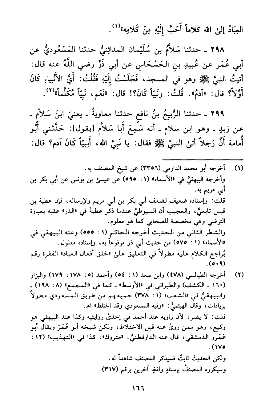 298 - حَدَّثَنَا سَلَّامُ بْنُ سُلَيْمَانَ الْمَدَائِنِيُّ، ثنا الْمَسْعُودِيُّ، عَنْ أَبِي عُمَرَ، عَنْ عُبَيْدِ بْنِ الْحَسْحَاسِ، عَنْ أَبِي ذَرٍّ، رَضِيَ اللَّهُ عَنْهُ قَالَ: أَتَيْتُ النَّبِيَّ صَلَّى اللهُ عَلَيْهِ وَسَلَّمَ وَهُوَ فِي الْمَسْجِدِ، فَجَلَسْتُ إِلَيْهِ، فَقُلْتُ: §أَيُّ الْأَنْبِيَاءِ كَانَ أَوَّلًا؟ قَالَ: «آدَمُ» ، قُلْتُ: وَنبِيًّا كَانَ؟ قَالَ: «نَعَمْ، نَبِيًّا مُكَلَّمًا»