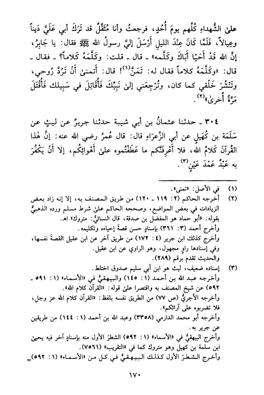 304 - حَدَّثَنَا عُثْمَانُ بْنُ أَبِي شَيْبَةَ، ثنا جَرِيرٌ، عَنْ لَيْثٍ، عَنْ سَلَمَةَ بْنِ كُهَيْلٍ، عَنْ أَبِي الزَّعْرَاءِ، قَالَ: قَالَ عُمَرُ رَضِيَ اللَّهُ عَنْهُ: «إِنَّ هَذَا §الْقُرْآنَ كَلَامُ اللَّهِ، فَلَا أَعْرِفَنَّكُمْ مَا عَطَفْتُمُوهُ عَلَى أَهْوَائِكُمْ، إِلَّا أَنْ يَكْفُرَ بِهِ عَمْدَ عَيْنٍ»
