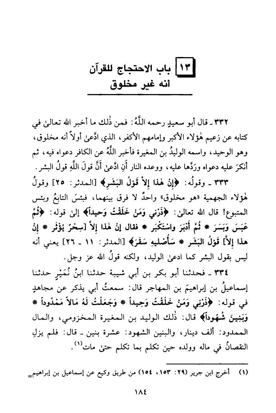 333 - وَقَوْلُهُ: {إِنْ هَذَا إِلَّا قَوْلُ الْبَشَرِ} [المدثر: 25] . وَقَوْلُ هَؤُلَاءِ الْجَهْمِيَّةِ: هُوَ مَخْلُوقٌ، وَاحِدٌ لَا فَرْقَ بَيْنَهُمَا، فَبِئْسَ التَّابِعُ، وَبِئْسَ الْمَتْبُوعُ قَالَ اللَّهُ تَعَالَى: {ذَرْنِي وَمَنْ خَلَقْتُ وَحِيدًا} [المدثر: 11] إِلَى قَوْلِهِ: {ثُمَّ عَبَسَ وَبَسَرَ، ثُمَّ أَدْبَرَ وَاسْتَكْبَرَ، فَقَالَ إِنْ هَذَا إِلَّا سِحْرٌ يُؤْثَرُ، إِنْ هَذَا إِلَّا قَوْلُ الْبَشَرِ، سَأُصْلِيهِ سَقَرَ} [المدثر: 23] . يَعْنِي أَنَّهُ لَيْسَ بِقَوْلِ الْبَشَرِ كَمَا ادَّعَى الْوَلِيدُ، وَلَكِنَّهُ قَوْلُ اللَّهِ عَزَّ وَجَلَّ.