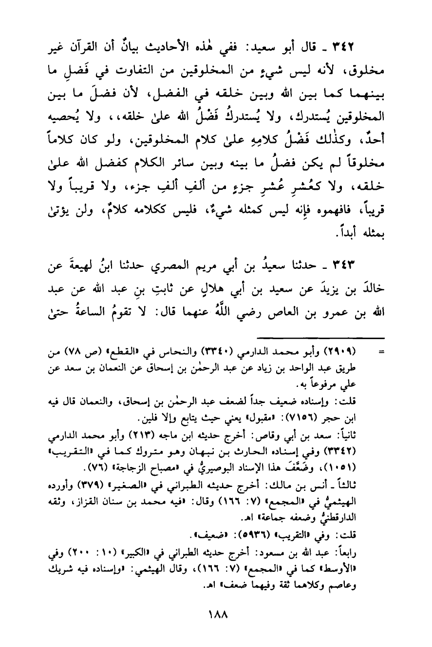 343 - حَدَّثَنَا سَعِيدُ بْنُ أَبِي مَرْيَمَ الْمِصْرِيُّ، ثنا ابْنُ لَهِيعَةَ، عَنْ خَالِدِ بْنِ يَزِيدَ، عَنْ سَعِيدِ بْنِ أَبِي هِلَالٍ، عَنْ ثَابِتِ بْنِ عَبْدِ اللَّهِ، عَنْ عَبْدِ اللَّهِ بْنِ عَمْرِو بْنِ الْعَاصِ، رَضِيَ اللَّهُ عَنْهُمَا قَالَ: " §لَا تَقُومُ السَّاعَةُ حَتَّى -[189]- يَرْجِعَ الْقُرْآنُ مِنْ حَيْثُ نَزَلَ، لَهُ دَوِيُّ كَدَوِيِّ النَّحْلِ، يَقُولُ: يَا رَبِّ مِنْكَ خَرَجْتُ وَإِلَيْكَ أَعُودُ، أُتْلَى وَلَا يُعْمَلُ بِي، أُتْلَى وَلَا يُعْمَلُ بِي