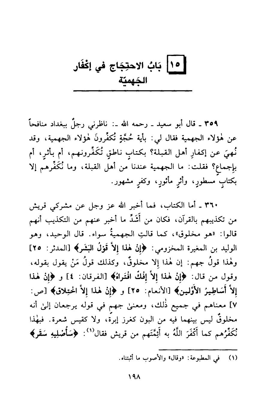 359 - قَالَ أَبُو سَعِيدٍ رَحِمَهُ اللَّهُ: نَاظَرَنِي رَجُلٌ بِبَغْدَادَ مُنَافِحًا عَنْ هَؤُلَاءِ الْجَهْمِيَّةِ، فَقَالَ لِي: بِأَيَّةِ حُجَّةٍ تُكَفِّرُونَ هَؤُلَاءِ الْجَهْمِيَّةَ، وَقَدْ نُهِيَ عَنْ إِكْفَارِ أَهْلِ الْقِبْلَةِ؟ بِكِتَابٍ نَاطِقٍ تُكَفِّرُونَهُمْ أَمْ بِأَثَرٍ أَمْ بِإِجْمَاعٍ؟ فَقُلْتُ: مَا الْجَهْمِيَّةُ عِنْدَنَا مِنْ أَهْلِ الْقِبْلَةِ، وَمَا نُكَفِّرُهُمْ إِلَّا بِكِتَابٍ مَسْطُورٍ وَأَثَرٍ مَأْثُورٍ وَكُفْرٍ مَشْهُورٍ.