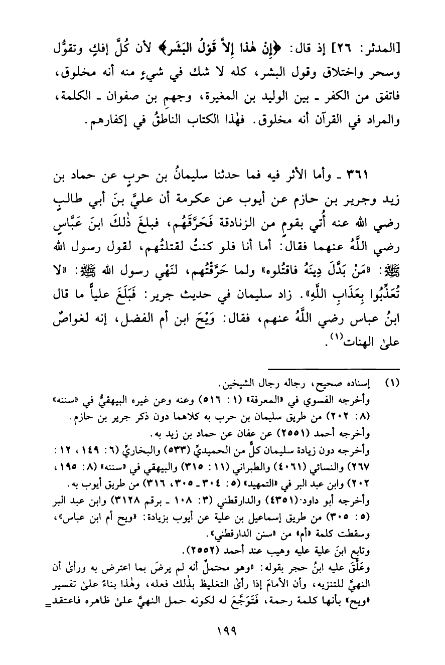 361 - وَأَمَّا الْأَثَرُ فِيهِ فَمَا حَدَّثَنَا سُلَيْمَانُ بْنُ حَرْبٍ، عَنْ حَمَّادِ بْنِ زَيْدٍ، وَجَرِيرِ بْنِ حَازِمٍ، عَنْ أَيُّوبَ، عَنْ عِكْرِمَةَ، أَنَّ عَلِيَّ بْنَ أَبِي طَالِبٍ، رَضِيَ اللَّهُ عَنْهُ أُتِيَ بِقَوْمٍ مِنَ الزَّنَادِقَةِ، فَحَرَّقَهُمْ، فَبَلَغَ ذَلِكَ ابْنَ عَبَّاسٍ رَضِيَ اللَّهُ عَنْهُمَا، فَقَالَ: أَمَّا أَنَا فَلَوْ كُنْتُ لَقَتَلْتُهُمْ، لِقَوْلِ رَسُولِ اللَّهِ صَلَّى اللهُ عَلَيْهِ وَسَلَّمَ: «§مَنْ بَدَّلَ دِينَهُ فَاقْتُلُوهُ» وَلَمَا حَرَّقْتُهُمْ لِنَهْيِ رَسُولِ اللَّهِ صَلَّى اللهُ عَلَيْهِ وَسَلَّمَ: «وَلَا تُعَذِّبُوا بِعَذَابِ اللَّهِ» زَادَ سُلَيْمَانُ فِي حَدِيثِ جَرِيرٍ: فَبَلَغَ عَلِيًّا مَا قَالَ ابْنُ عَبَّاسٍ رَضِيَ اللَّهُ عَنْهُمْ، فَقَالَ: وَيْحَ ابْنِ أُمِّ الْفَضْلِ، إِنَّهُ لَغَوَّاصٌ عَلَى الْهَنَاتِ