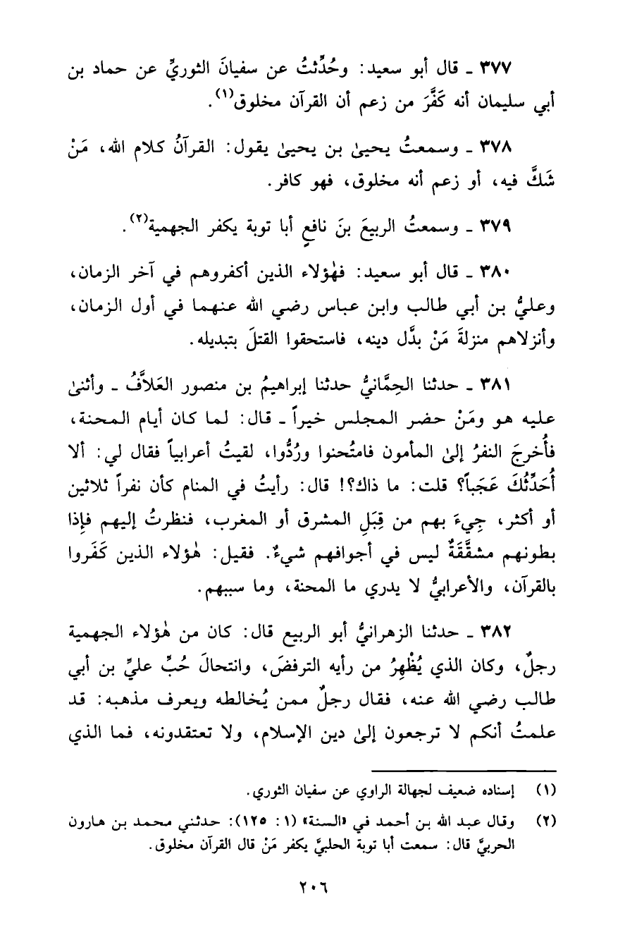 377 - وَحُدِّثْتُ عَنْ سُفْيَانَ الثَّوْرِيِّ، عَنْ حَمَّادِ بْنِ أَبِي سُلَيْمَانَ، §أَنَّهُ كَفَّرَ مَنْ زَعَمَ أَنَّ الْقُرْآنَ مَخْلُوقٌ "