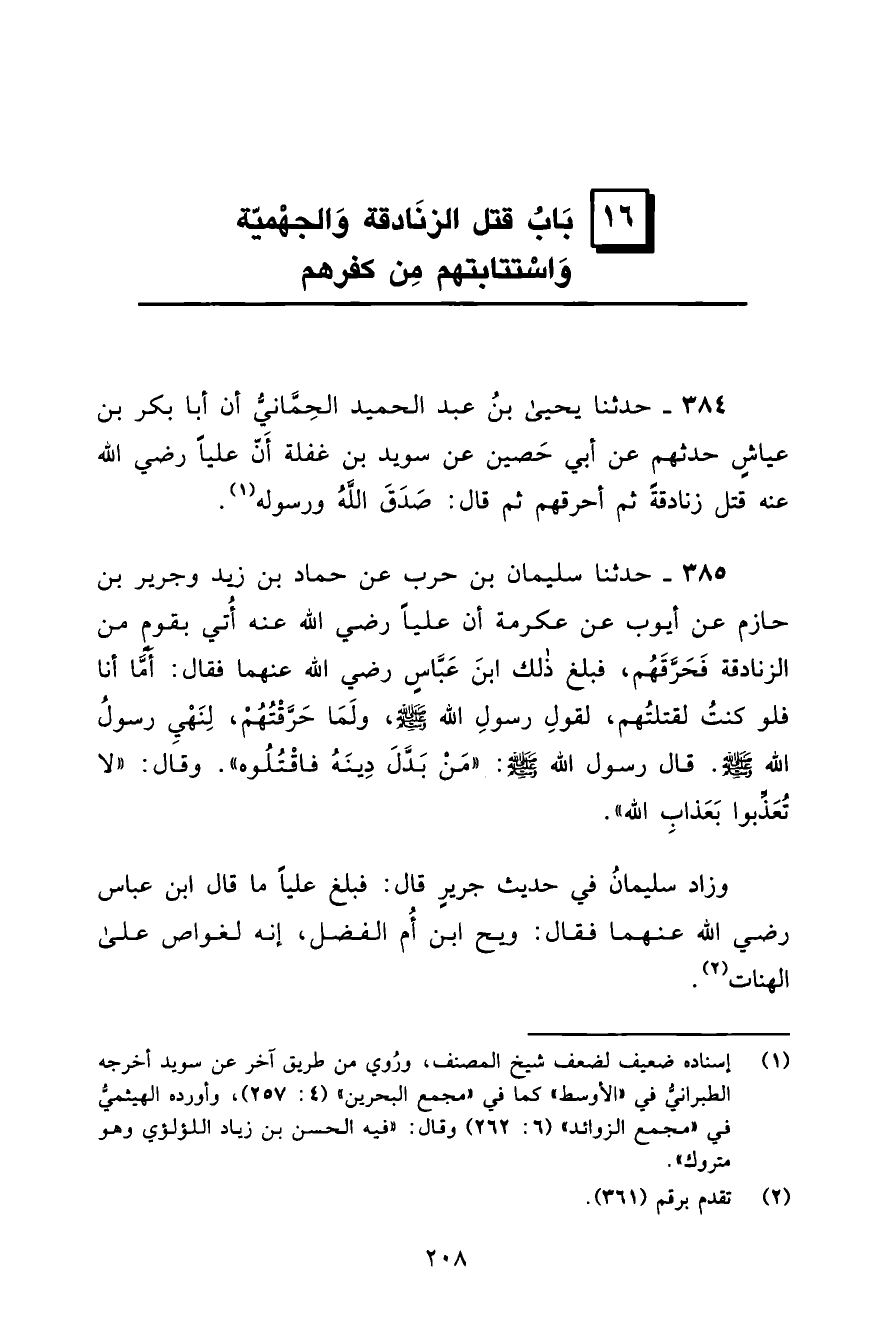 384 - حَدَّثَنَا يَحْيَى بْنُ عَبْدِ الْحَمِيدِ الْحِمَّانِيُّ، أَنَّ أَبَا بَكْرِ بْنَ عَيَّاشٍ، حَدَّثَهُمْ عَنْ أَبِي حُصَيْنٍ، عَنْ سُوَيْدِ بْنِ غَفَلَةَ، أَنَّ عَلِيًّا، رَضِيَ اللَّهُ عَنْهُ §قَتَلَ زَنَادِقَةً ثُمَّ أَحْرَقَهُمْ، ثُمَّ قَالَ: صَدَقَ اللَّهُ وَرَسُولُهُ