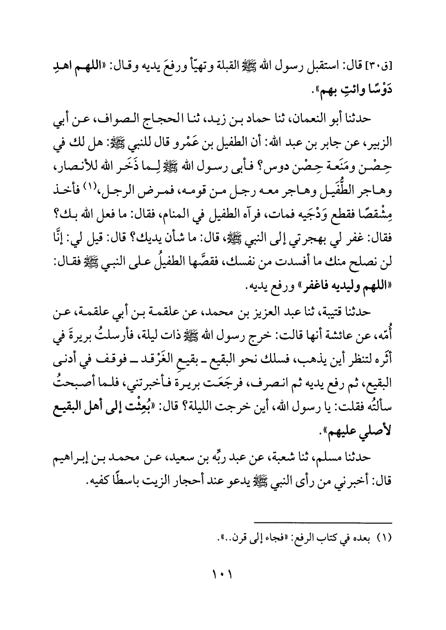 [ق ٣٠] قال: استقبل رسول الله - صلى الله عليه وسلم - القبلة وتهيّأ ورفعَ يديه وقال: «اللهم اهدِ دَوْسًا وائتِ بهم».