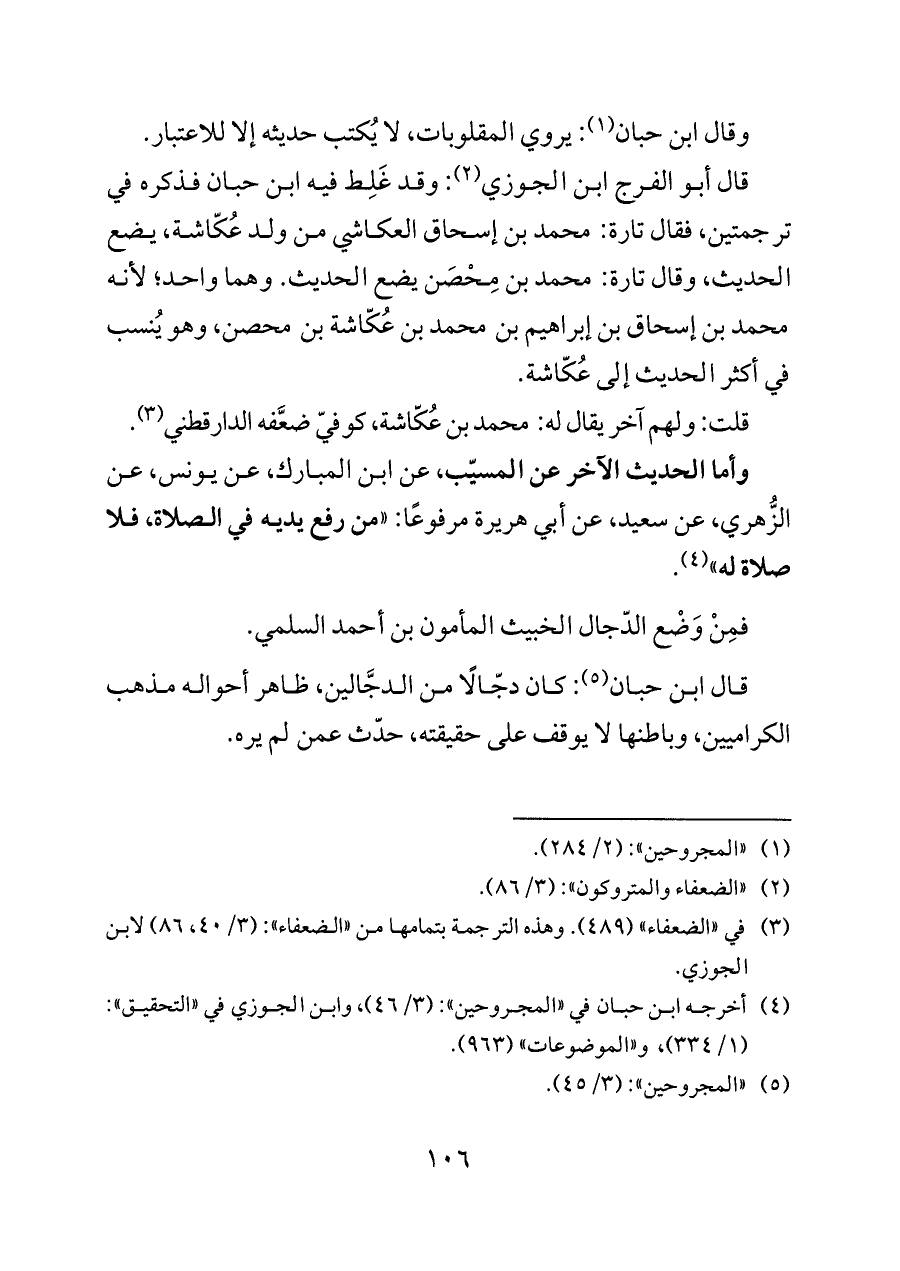 قال أبو الفرج ابن الجوزي (¬٢): وقد غَلِط فيه ابن حبان فذكره في ترجمتين، فقال تارة: محمد بن إسحاق العكاشي من ولد عُكّاشة، يضع الحديث، وقال تارة: محمد بن مِحْصَن يضع الحديث. وهما واحد؛ لأنه محمد بن إسحاق بن إبراهيم بن محمد بن عُكّاشة بن محصن، وهو يُنسب في أكثر الحديث إلى عُكّاشة.