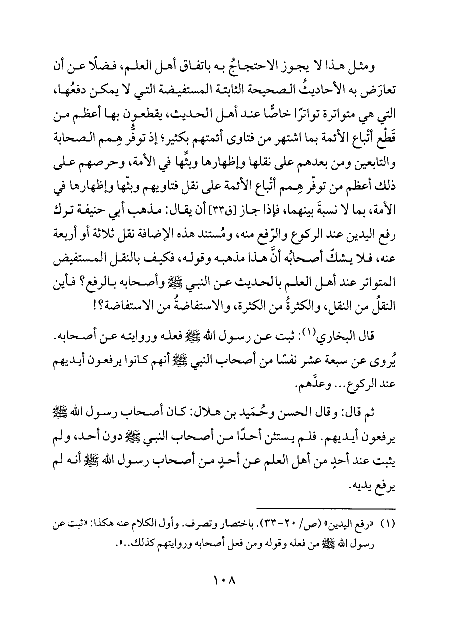 (¬١) «رفع اليدين» (ص/٢٠ - ٣٣). باختصار وتصرف. وأول الكلام عنه هكذا: «ثبت عن رسول الله - صلى الله عليه وسلم - من فعله وقوله ومن فعل أصحابه وروايتهم كذلك .. ».