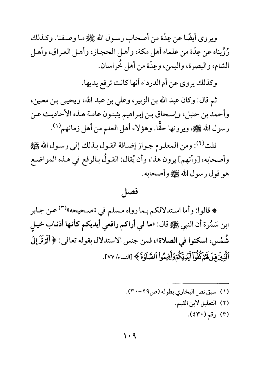 * قالوا: وأما استدلالكم بما رواه مسلم في «صحيحه» (¬٣) عن جابر ابن سَمُرة أن النبي - صلى الله عليه وسلم - قال: «ما لي أراكم رافعي أيديكم كأنها أذناب خيلٍ شُمْس، اسكنوا في الصلاة»، فمن جنس الاستدلال بقوله تعالى: {أَلَمْ تَرَ إِلَى الَّذِينَ قِيلَ لَهُمْ كُفُّوا أَيْدِيَكُمْ وَأَقِيمُوا الصَّلَاةَ} [النساء/٧٧].