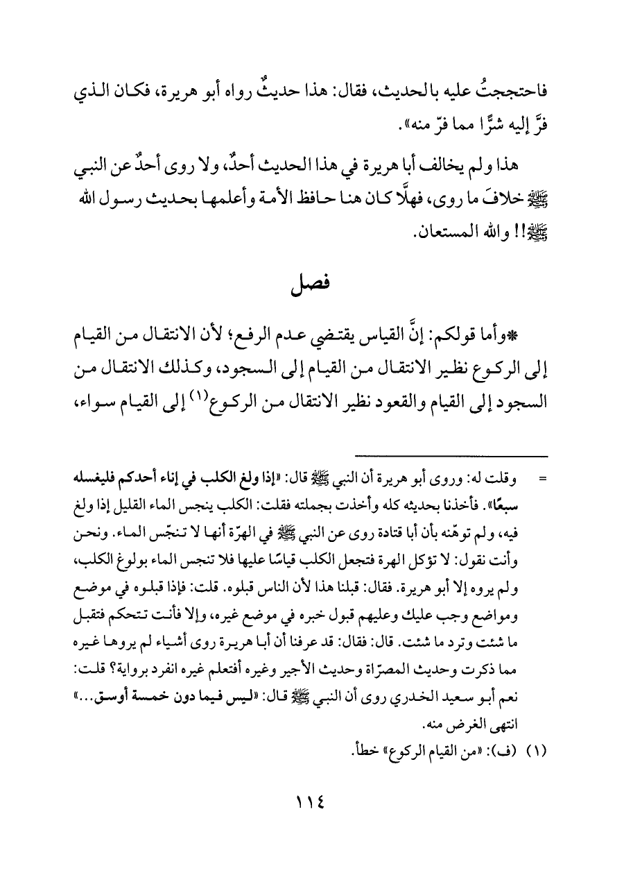 *وأما قولكم: إنَّ القياس يقتضي عدم الرفع؛ لأن الانتقال من القيام إلى الركوع نظير الانتقال من القيام إلى السجود، وكذلك الانتقال من السجود إلى القيام والقعود نظير الانتقال من الركوع (¬١) إلى القيام سواء،