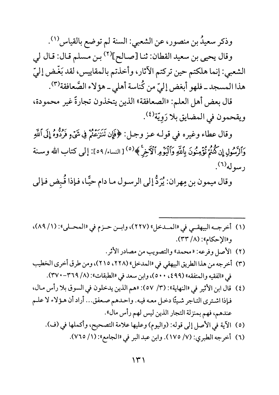 وقال يحيى بن سعيد القطان: ثنا [صالح] (¬٢) بن مسلم قال: قال لي الشعبي: إنما هلكتم حين تركتم الآثار، وأخذتم بالمقاييس، لقد بَغّض إليّ هذا المسجد ــ فلهو أبغض إليّ من كُناسة أهلي ــ هؤلاء الصَّعافقة (¬٣).