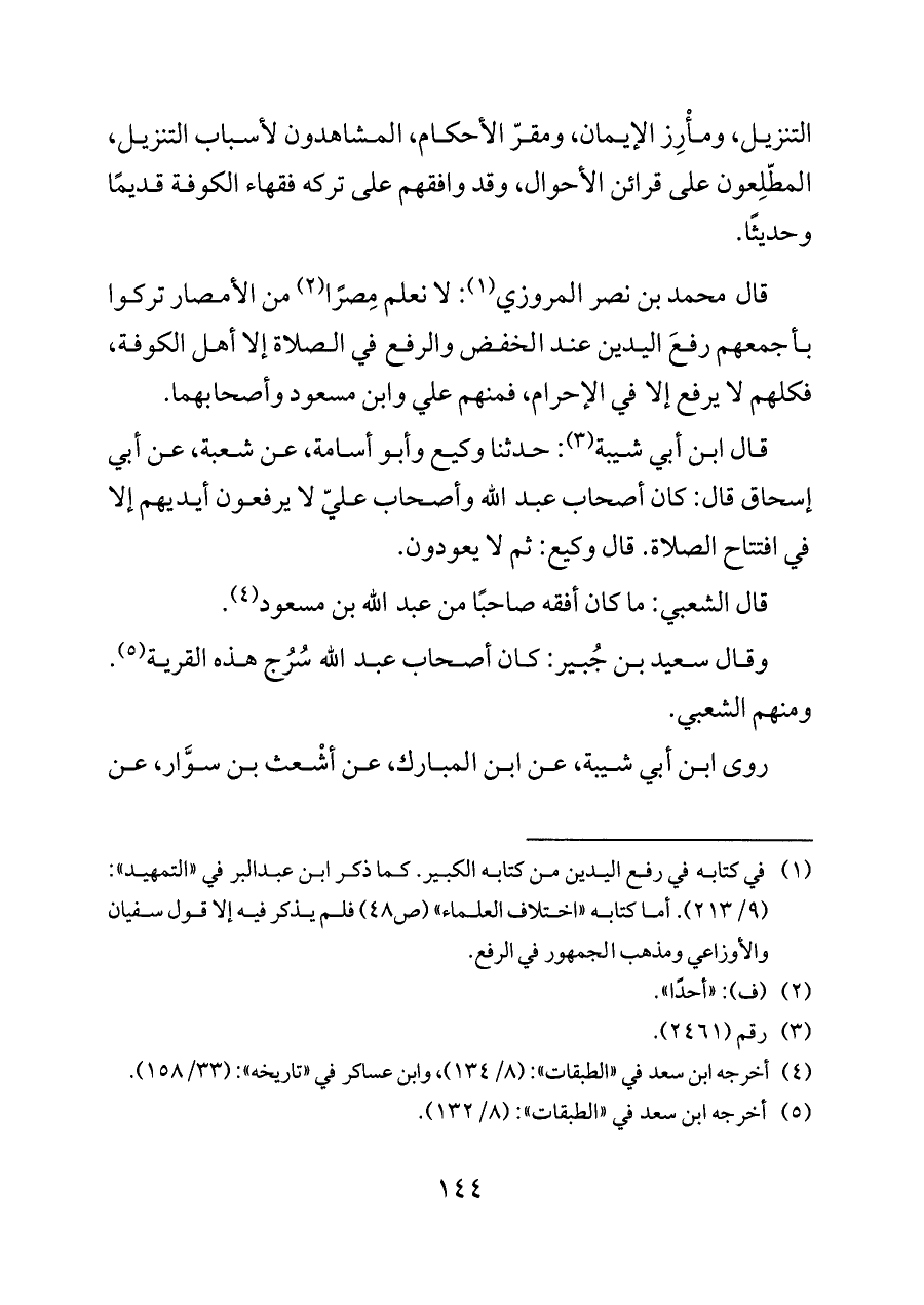 قال محمد بن نصر المروزي (¬١): لا نعلم مِصرًا (¬٢) من الأمصار تركوا بأجمعهم رفعَ اليدين عند الخفض والرفع في الصلاة إلا أهل الكوفة، فكلهم لا يرفع إلا في الإحرام، فمنهم علي وابن مسعود وأصحابهما.