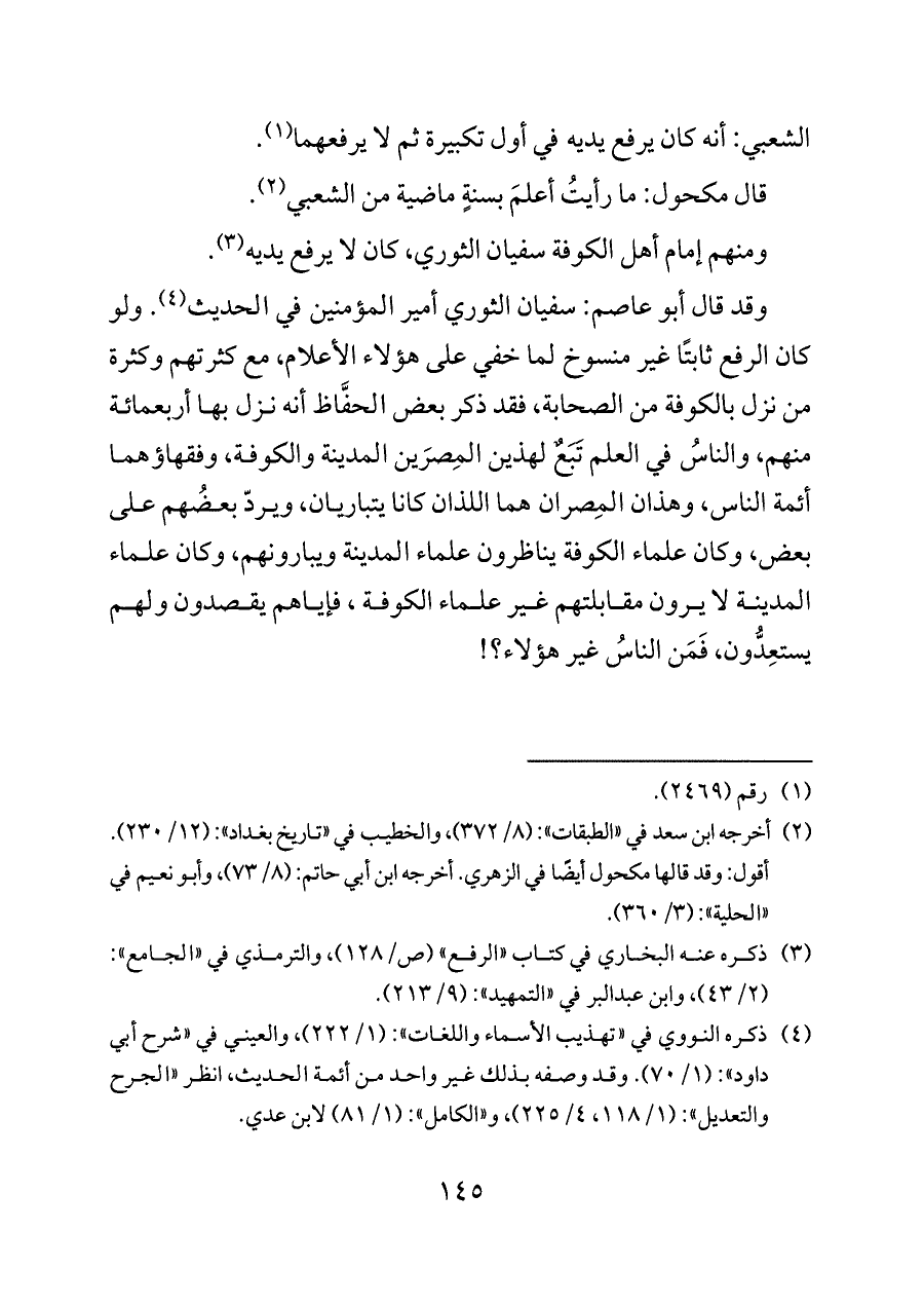 وقد قال أبو عاصم: سفيان الثوري أمير المؤمنين في الحديث (¬٤). ولو كان الرفع ثابتًا غير منسوخ لما خفي على هؤلاء الأعلام، مع كثرتهم وكثرة من نزل بالكوفة من الصحابة، فقد ذكر بعض الحفَّاظ أنه نزل بها أربعمائة منهم، والناسُ في العلم تَبَعٌ لهذين المِصرَين المدينة والكوفة، وفقهاؤهما أئمة الناس، وهذان المِصران هما اللذان كانا يتباريان، ويردّ بعضُهم على بعض، وكان علماء الكوفة ينا