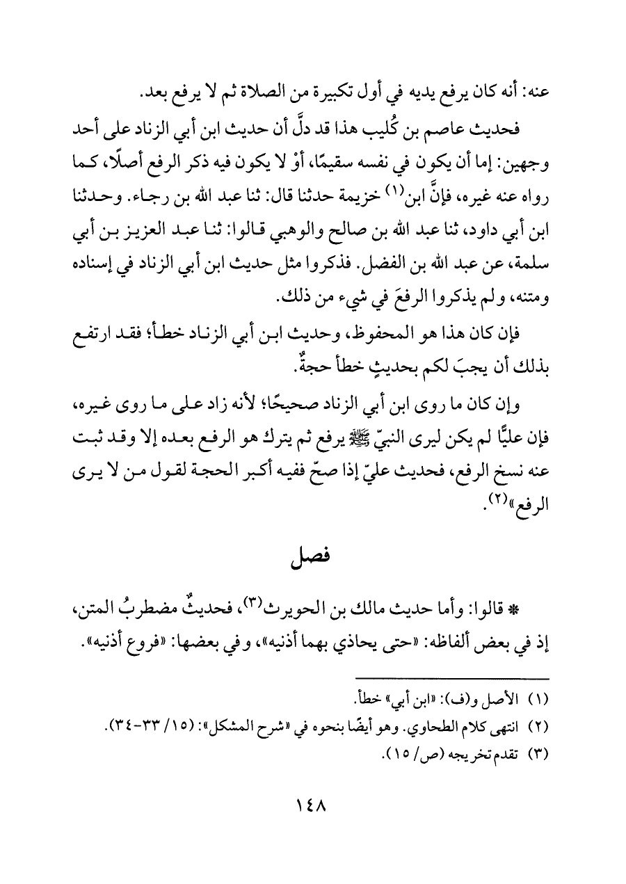 فحديث عاصم بن كُليب هذا قد دلَّ أن حديث ابن أبي الزناد على أحد وجهين: إما أن يكون في نفسه سقيمًا، أوْ لا يكون فيه ذكر الرفع أصلًا، كما رواه عنه غيره، فإنَّ ابن (¬١) خزيمة حدثنا قال: ثنا عبد الله بن رجاء. وحدثنا ابن أبي داود، ثنا عبد الله بن صالح والوهبي قالوا: ثنا عبد العزيز بن أبي سلمة، عن عبد الله بن الفضل. فذكروا مثل حديث ابن أبي الزناد في إسناده ومتنه، ولم يذكروا الرفعَ في شيء من ذلك.