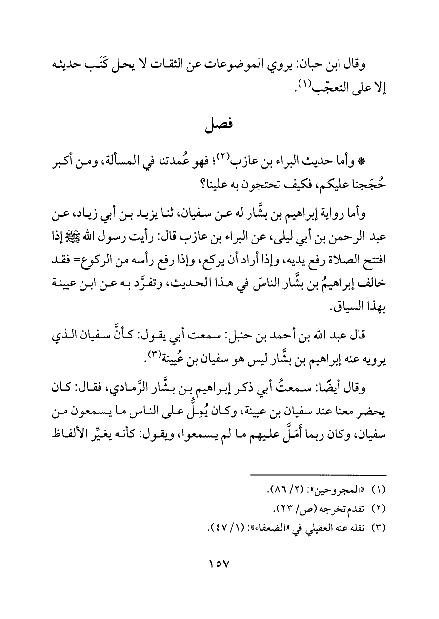 وأما رواية إبراهيم بن بشَّار له عن سفيان، ثنا يزيد بن أبي زياد، عن عبد الرحمن بن أبي ليلى، عن البراء بن عازب قال: رأيت رسول الله - صلى الله عليه وسلم - إذا افتتح الصلاة رفع يديه، وإذا أراد أن يركع، وإذا رفع رأسه من الركوع= فقد خالف إبراهيمُ بن بشَّار الناسَ في هذا الحديث، وتفرَّد به عن ابن عيينة بهذا السياق.