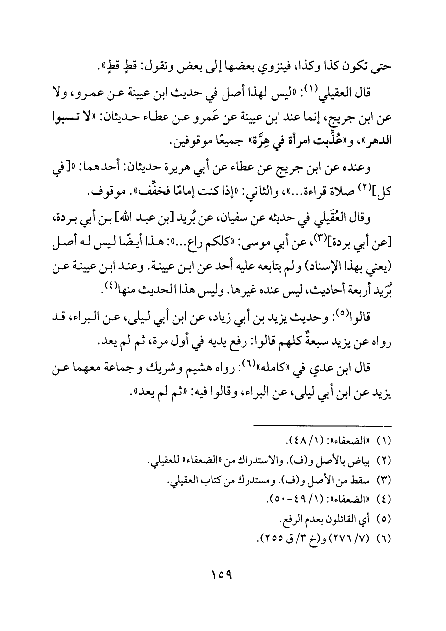 وقال العُقَيلي في حديثه عن سفيان، عن بُريد [بن عبد الله] بن أبي بردة، [عن أبي بردة] (¬٣)، عن أبي موسى: «كلكم راع ... »: هذا أيضًا ليس له أصل (يعني بهذا الإسناد) ولم يتابعه عليه أحد عن ابن عيينة. وعند ابن عيينة عن بُرَيد أربعة أحاديث، ليس عنده غيرها. وليس هذا الحديث منها (¬٤).