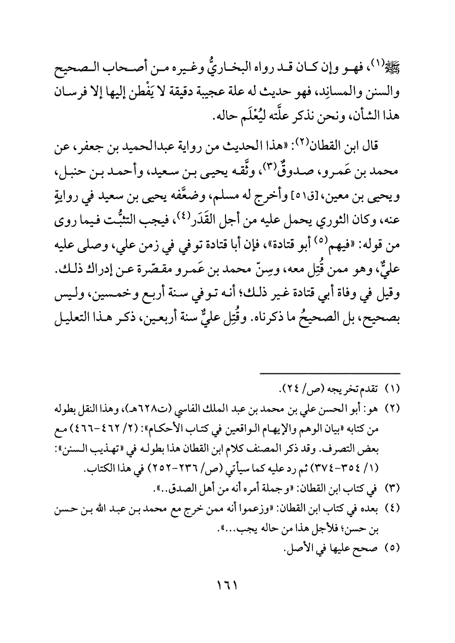 قال ابن القطان (¬٢): «هذا الحديث من رواية عبدالحميد بن جعفر، عن محمد بن عَمرو، صدوقٌ (¬٣)، وثَّقه يحيى بن سعيد، وأحمد بن حنبل، ويحيى بن معين، [ق ٥١] وأخرج له مسلم، وضعَّفه يحيى بن سعيد في روايةٍ عنه، وكان الثوري يحمل عليه من أجل القَدَر (¬٤)، فيجب التثبُّت فيما روى من قوله: «فيهم (¬٥) أبو قتادة»، فإن أبا قتادة توفي في زمن علي، وصلى عليه عليٌّ، وهو ممن قُتِل معه، وسِنّ محمد بن عَمرو مقصّرة عن إدراك ذلك. وقيل في وفاة أبي قتادة غير ذلك؛ أنه توفي سنة أربع وخمسين، وليس بصحيح، بل الصحيحُ ما ذكرناه. وقُتِل عليٌّ سنة أربعين، ذكر هذا التعليل