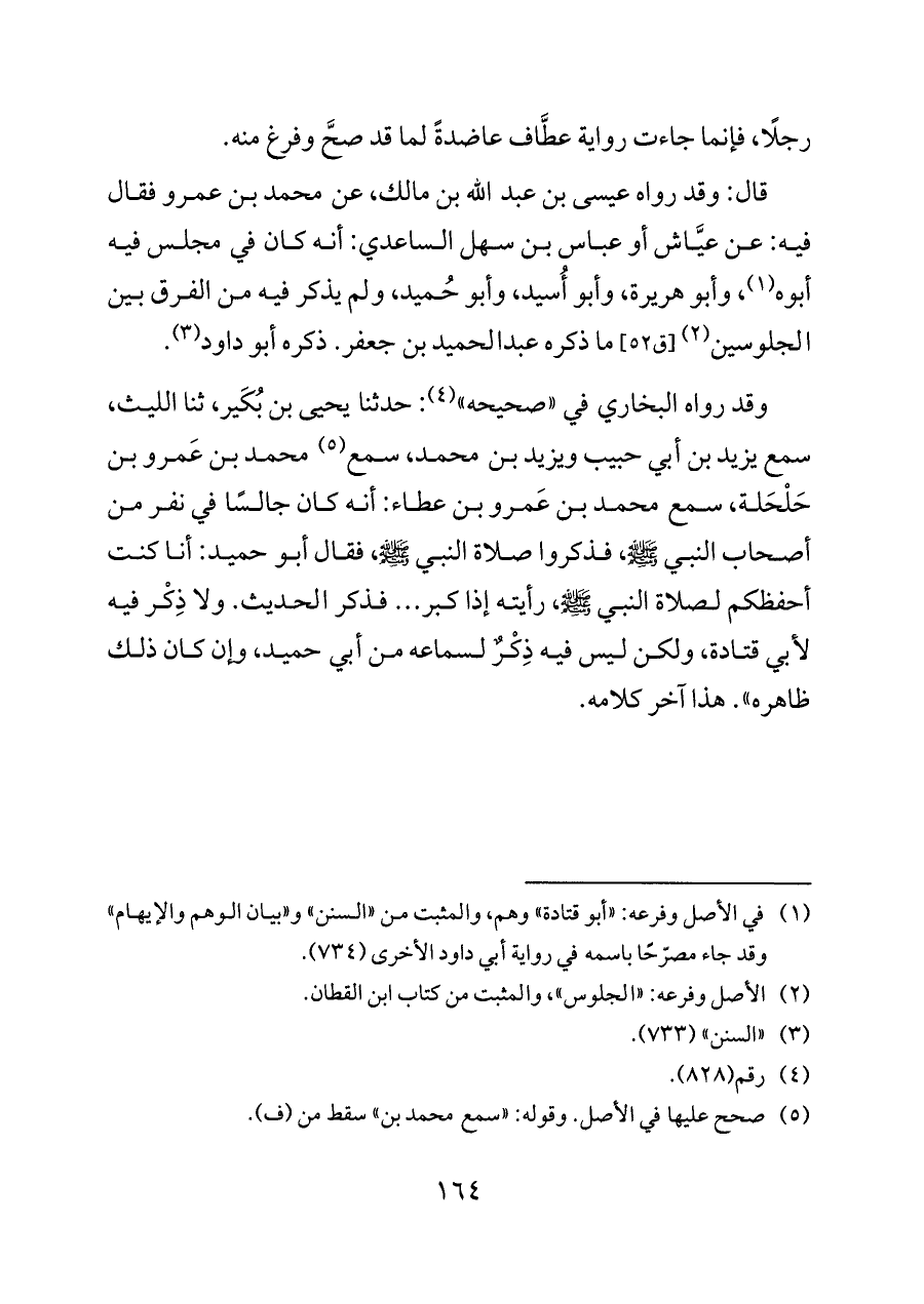 قال: وقد رواه عيسى بن عبد الله بن مالك، عن محمد بن عمرو فقال فيه: عن عيَّاش أو عباس بن سهل الساعدي: أنه كان في مجلس فيه أبوه (¬١)، وأبو هريرة، وأبو أُسيد، وأبو حُميد، ولم يذكر فيه من الفرق بين الجلوسين (¬٢) [ق ٥٢] ما ذكره عبدالحميد بن جعفر. ذكره أبو داود (¬٣).