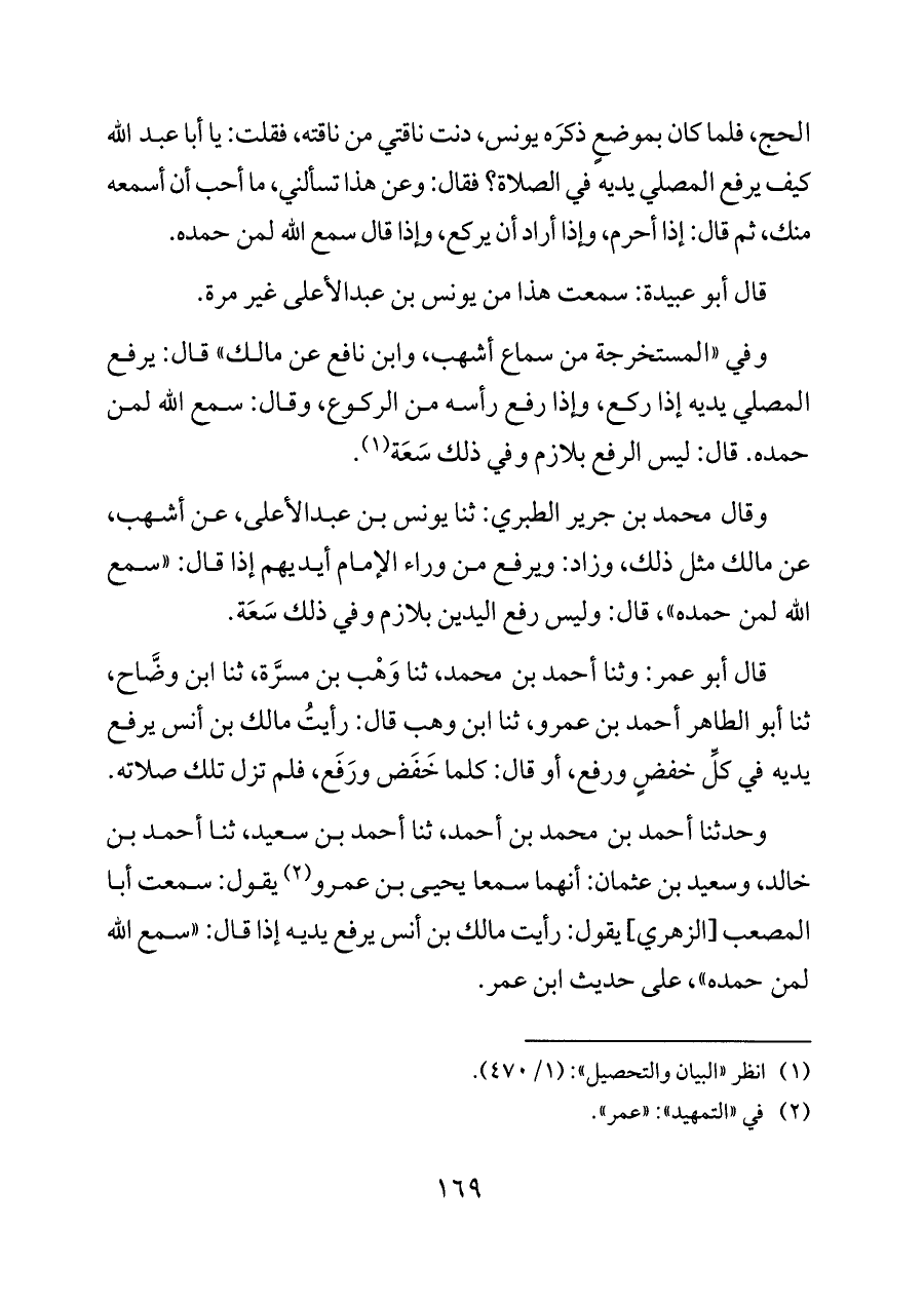قال أبو عمر: وثنا أحمد بن محمد، ثنا وَهْب بن مسرَّة، ثنا ابن وضَّاح، ثنا أبو الطاهر أحمد بن عمرو، ثنا ابن وهب قال: رأيتُ مالك بن أنس يرفع يديه في كلِّ خفضٍ ورفع، أو قال: كلما خَفَض ورَفَع، فلم تزل تلك صلاته.