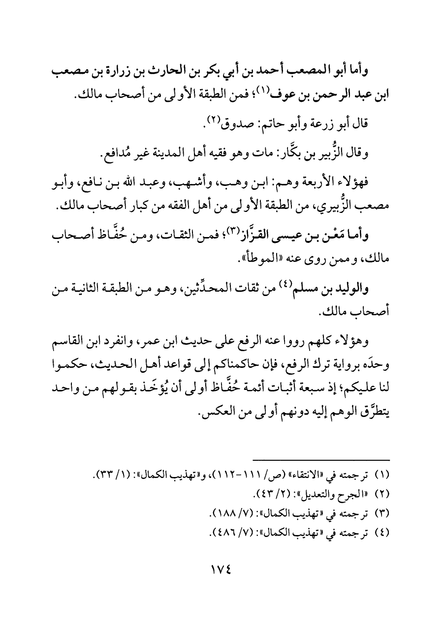 فهؤلاء الأربعة وهم: ابن وهب، وأشهب، وعبد الله بن نافع، وأبو مصعب الزُّبيري، من الطبقة الأولى من أهل الفقه من كبار أصحاب مالك.