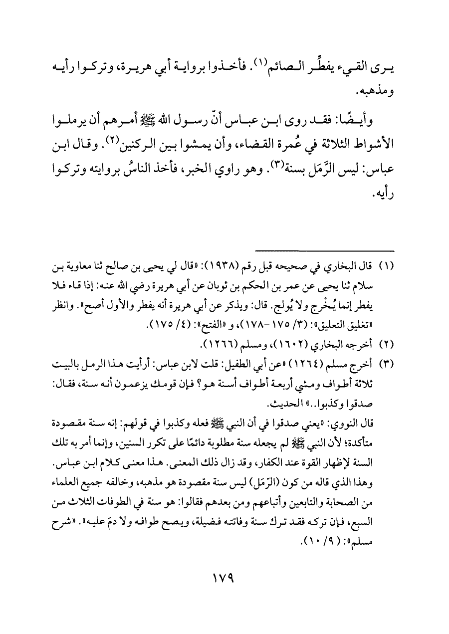 وأيضًا: فقد روى ابن عباس أنّ رسول الله - صلى الله عليه وسلم - أمرهم أن يرملوا الأشواط الثلاثة في عُمرة القضاء، وأن يمشوا بين الركنين (¬٢). وقال ابن عباس: ليس الرَّمَل بسنة (¬٣). وهو راوي الخبر، فأخذ الناسُ بروايته وتركوا رأيه.