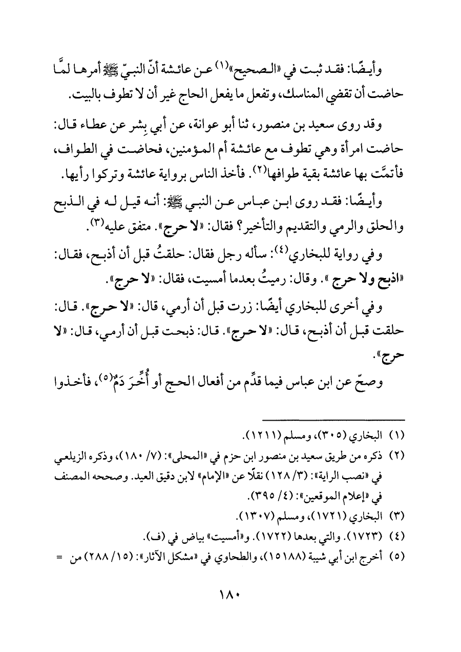 وأيضًا: فقد روى ابن عباس عن النبي - صلى الله عليه وسلم -: أنه قيل له في الذبح والحلق والرمي والتقديم والتأخير؟ فقال: «لا حرج». متفق عليه (¬٣).