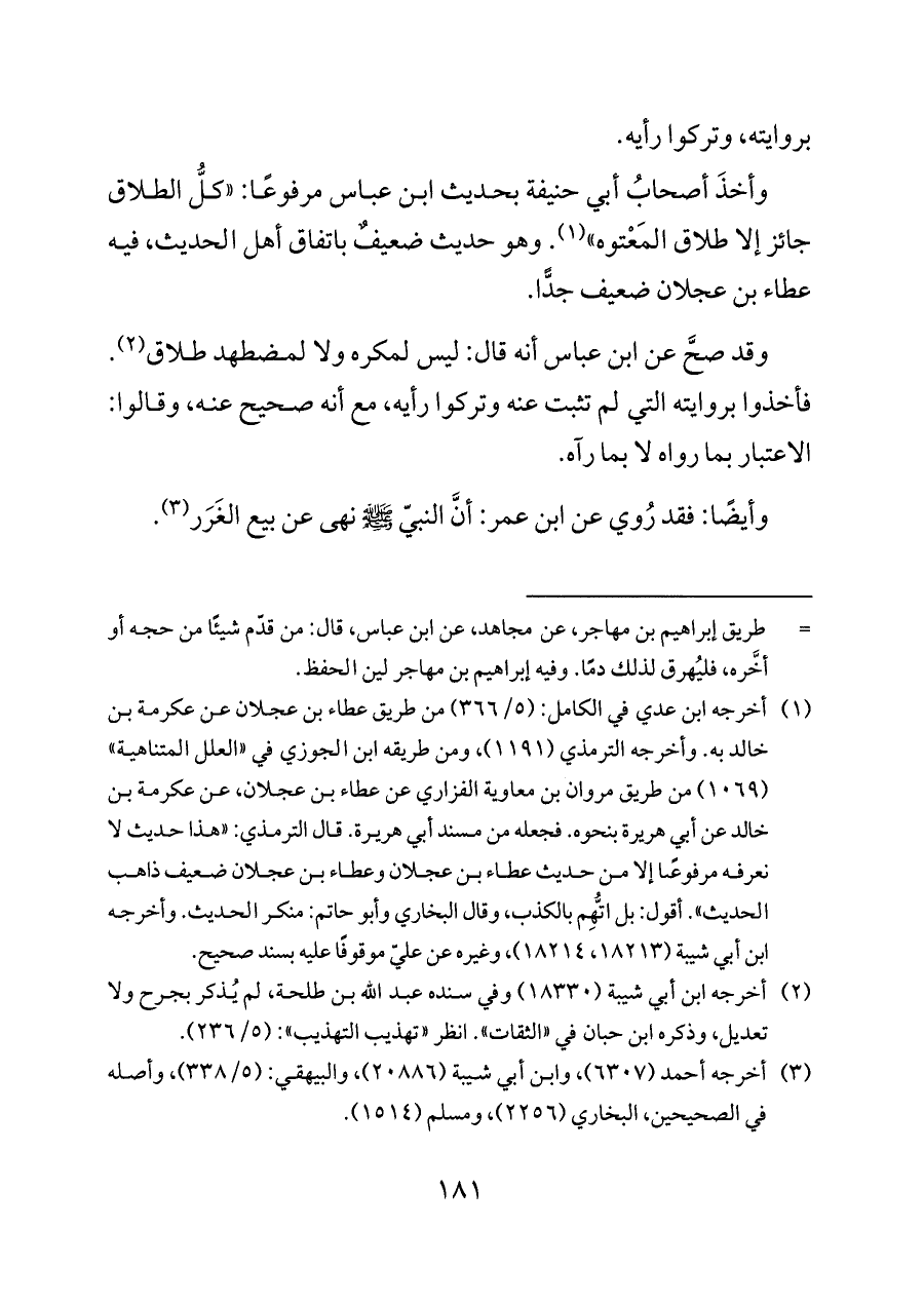 وقد صحَّ عن ابن عباس أنه قال: ليس لمكره ولا لمضطهد طلاق (¬٢). فأخذوا بروايته التي لم تثبت عنه وتركوا رأيه، مع أنه صحيح عنه، وقالوا: الاعتبار بما رواه لا بما رآه.