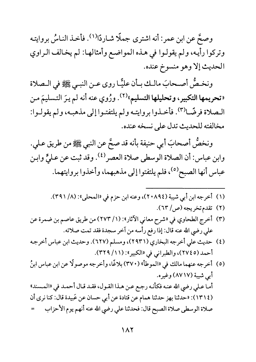 ونخصُّ أصحابَ مالك بأن عليًّا روى عن النبي - صلى الله عليه وسلم - في الصلاة «تحريمها التكبير، وتحليلها التسليم» (¬٢). ورُوي عنه أنه لم يرَ التسليمَ من الصلاة فرضًا (¬٣). فأخذوا بروايته ولم يلتفتوا إلى مذهبه، ولم يقولوا: مخالفته للحديث تدل على نسخه عنده.