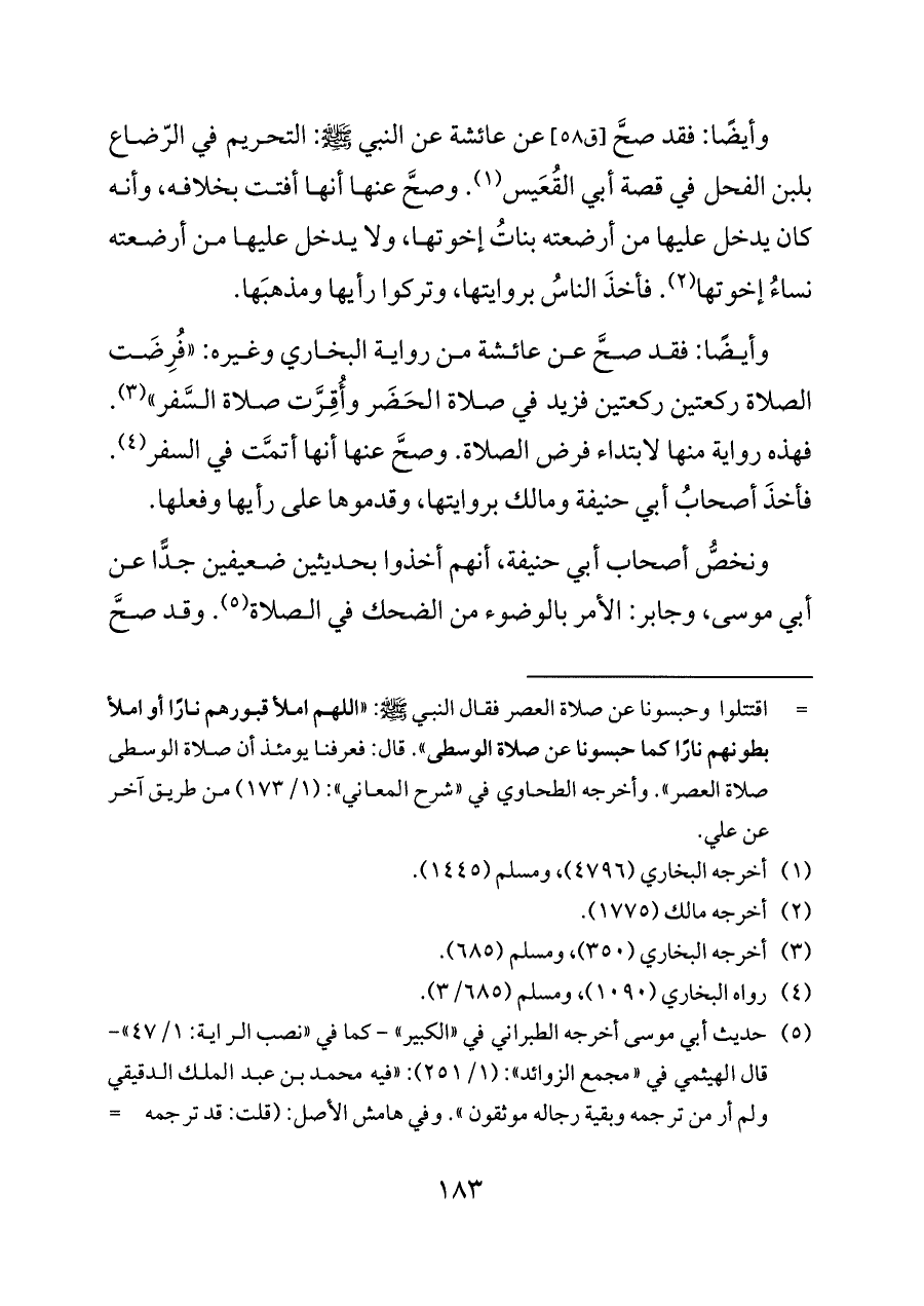 وأيضًا: فقد صحَّ [ق ٥٨] عن عائشة عن النبي - صلى الله عليه وسلم -: التحريم في الرّضاع بلبن الفحل في قصة أبي القُعَيس (¬١). وصحَّ عنها أنها أفتت بخلافه، وأنه كان يدخل عليها من أرضعته بناتُ إخوتها، ولا يدخل عليها من أرضعته نساءُ إخوتها (¬٢). فأخذَ الناسُ بروايتها، وتركوا رأيها ومذهبَها.