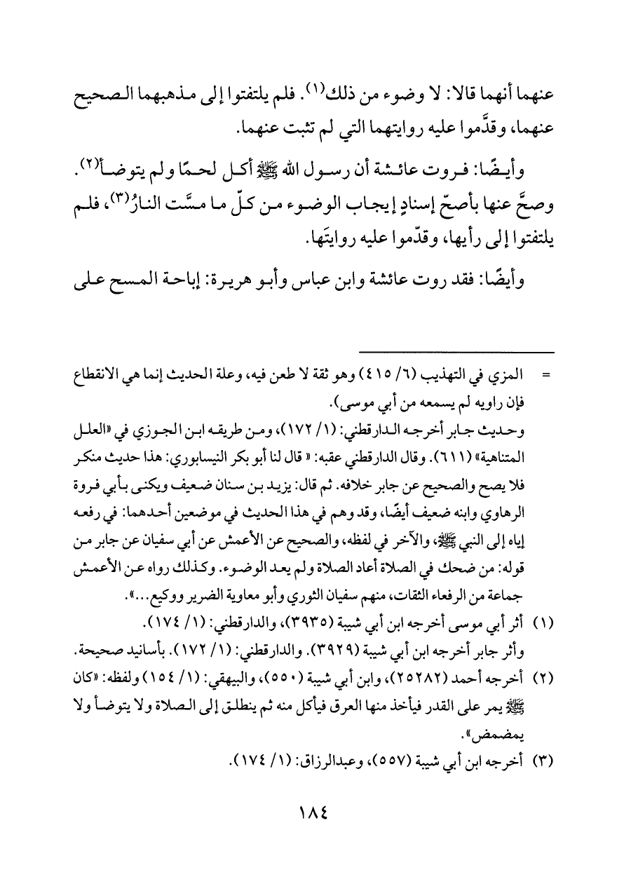 وأيضًا: فروت عائشة أن رسول الله - صلى الله عليه وسلم - أكل لحمًا ولم يتوضأ (¬٢). وصحَّ عنها بأصحّ إسنادٍ إيجاب الوضوء من كلّ ما مسَّت النارُ (¬٣)، فلم يلتفتوا إلى رأيها، وقدّموا عليه روايتَها.