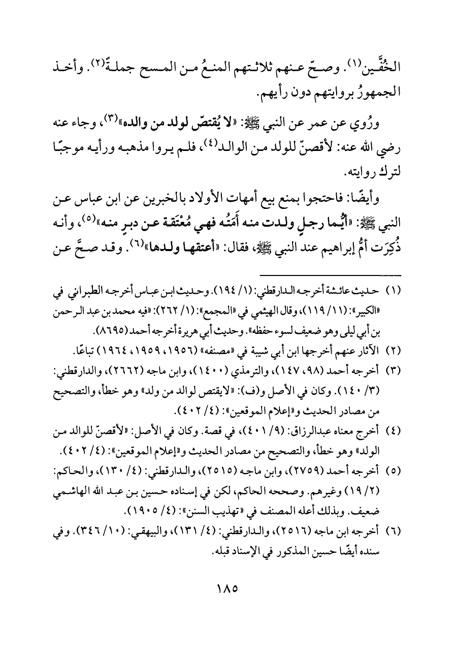 (¬٣) أخرجه أحمد (٩٨، ١٤٧)، والترمذي (١٤٠٠)، وابن ماجه (٢٦٦٢)، والدارقطني: (٣/ ١٤٠). وكان في الأصل و (ف): «لايقتص لوالد من ولد» وهو خطأ، والتصحيح من مصادر الحديث و «إعلام الموقعين»: (٤/ ٤٠٢).