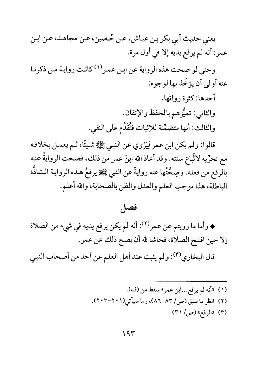 قالوا: ولم يكن ابن عمر لِيَرْوي عن النبي - صلى الله عليه وسلم - شيئًا، ثم يعمل بخلافه مع تحرِّيه لاتِّباع سنته. وقد أعاذ الله ابنَ عمر من ذلك، فصحت الروايةُ عنه بالرفع من فعله. وصِحَّتُها عنه روايةً عن النبي - صلى الله عليه وسلم - يرفعُ هذه الرواية الشاذَّة الباطلة، هذا موجب العلم والعدل والظن بالصحابة، والله أعلم.
