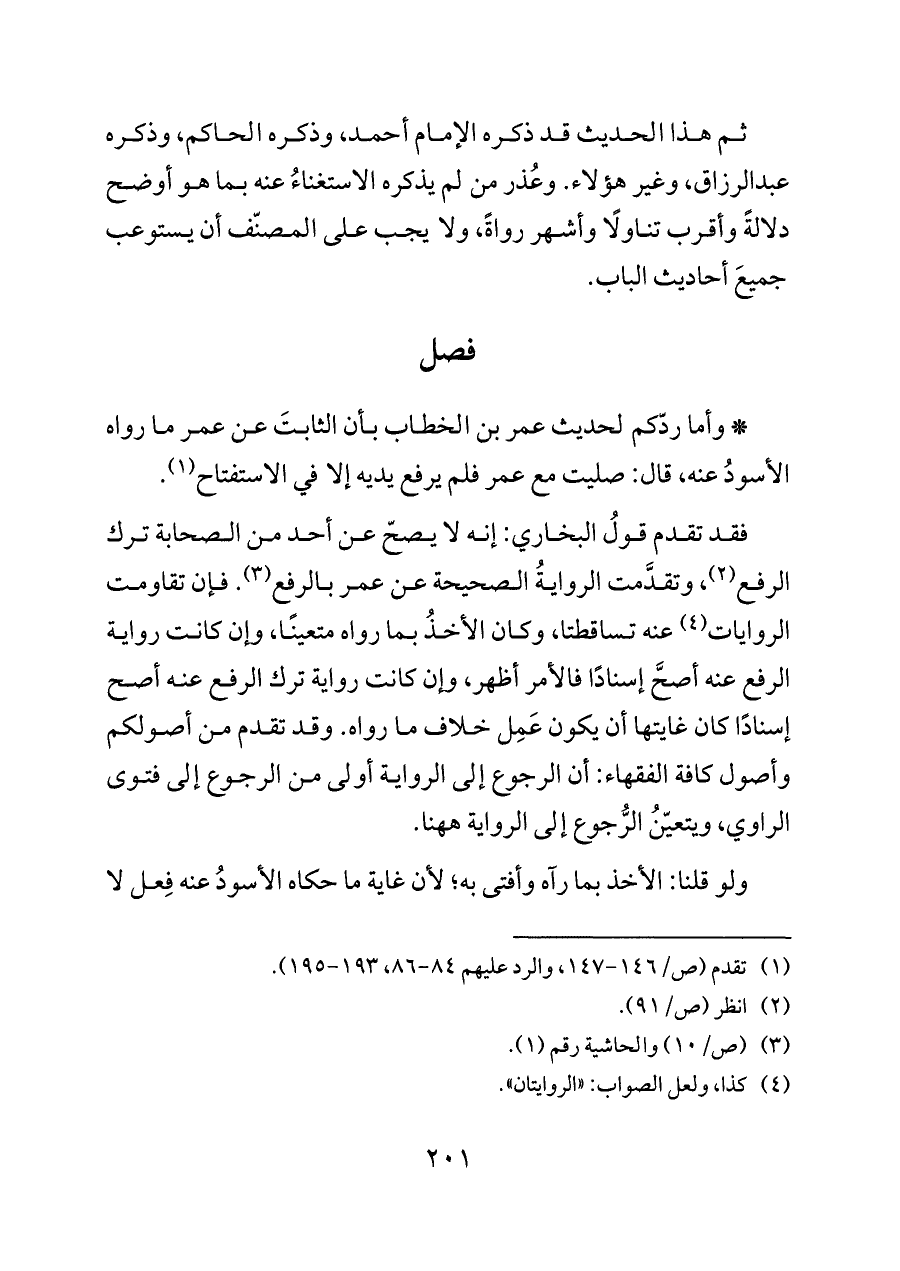 فقد تقدم قولُ البخاري: إنه لا يصحّ عن أحد من الصحابة ترك الرفع (¬٢)، وتقدَّمت الروايةُ الصحيحة عن عمر بالرفع (¬٣). فإن تقاومت الروايات (¬٤) عنه تساقطتا، وكان الأخذُ بما رواه متعينًا، وإن كانت رواية الرفع عنه أصحَّ إسنادًا فالأمر أظهر، وإن كانت رواية ترك الرفع عنه أصح إسنادًا كان غايتها أن يكون عَمِل خلاف ما رواه. وقد تقدم من أصولكم وأصول كافة الفقهاء: أن الرجوع إلى الرواية أولى من الرجوع إلى فتوى الراوي، ويتعيّنُ الرُّجوع إلى الرواية ههنا.